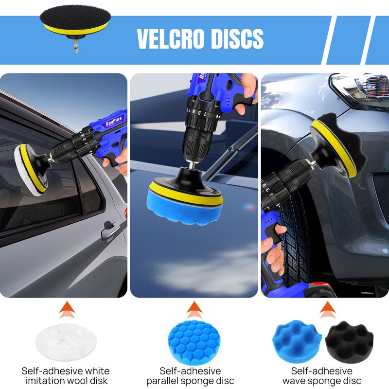 【Car Grooming Cleaning Kit】3 buffing pads and 1 faux wool pad in the car cleaning kit are washable and reusable, if needed, use the sticky discs in the kit to quickly change the buffing pads.Two wax applicators, two towels, a car wash sponge, and a car wash glove. Microfiber Gloves reduce skin damage from detergents during car washes. The sponge is super absorbent .Car wash towels are very soft and won't scratch any surfaces.