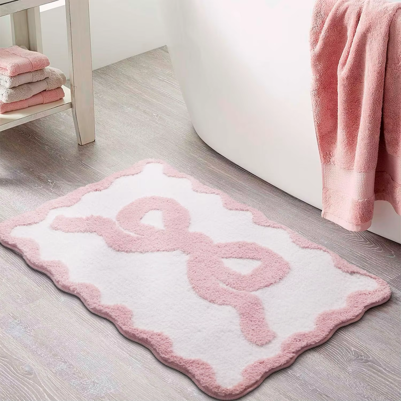VIKAMA 1pcs Pink Bow Bath Mat for Bathroom Cute Preppy Rugs with Scalloped Edges, Soft Microfiber, Ultra Absorbent, Non-Slip
