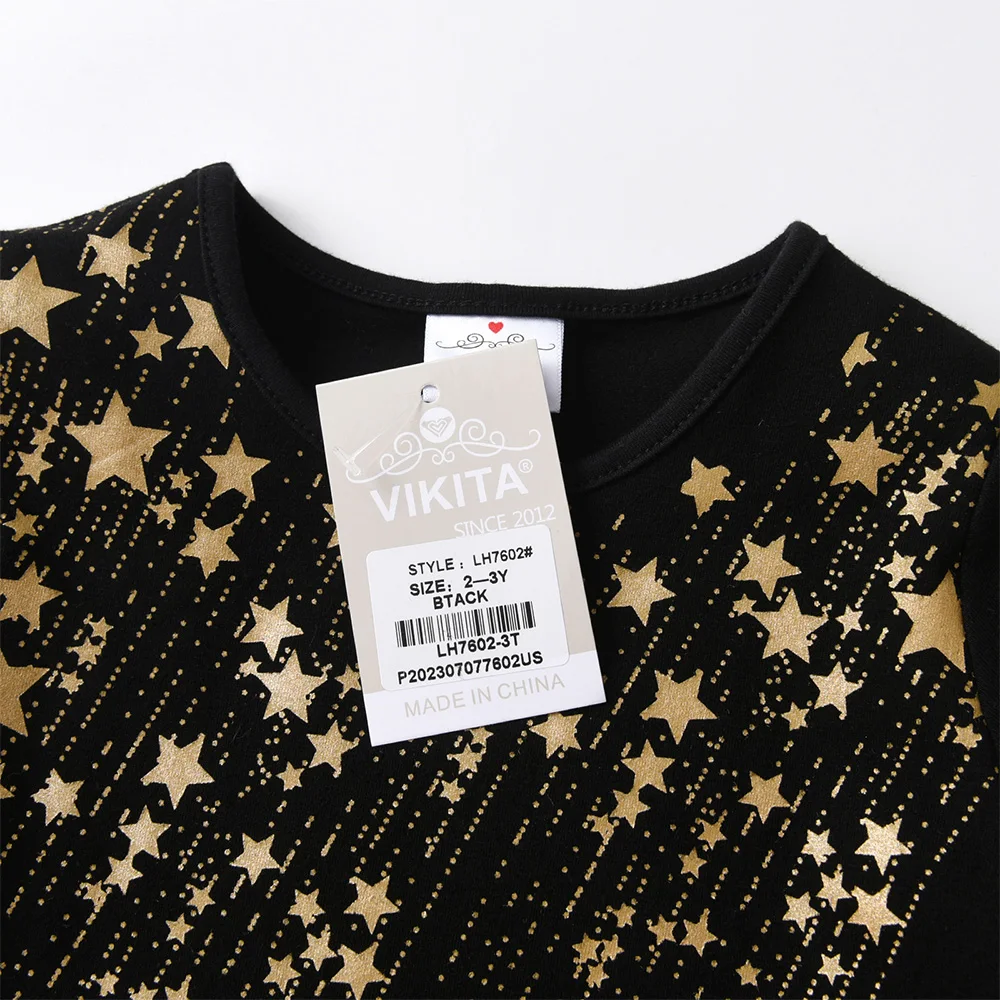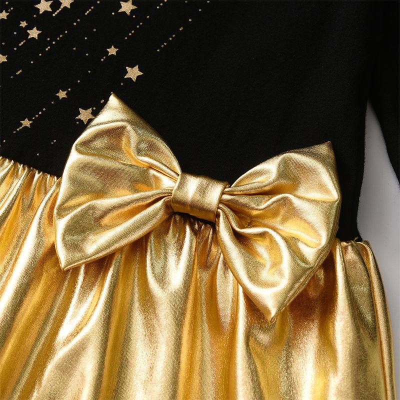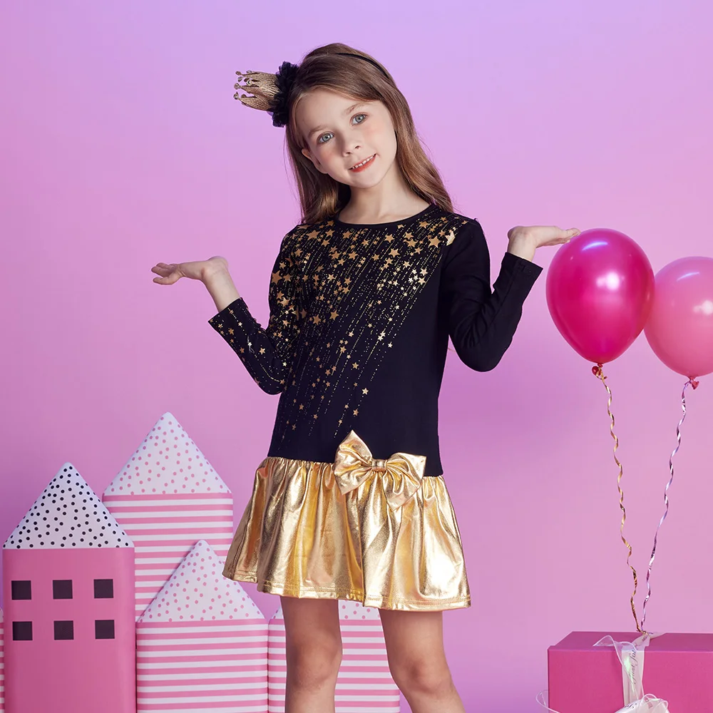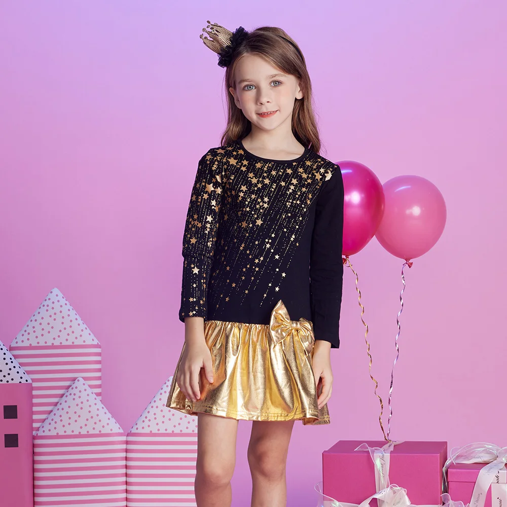VIKITA Girls Christmas New Year Gift Dress Kids Autumn Winter Golden Star Print Straight Dresses with Bowknot Children Clothes