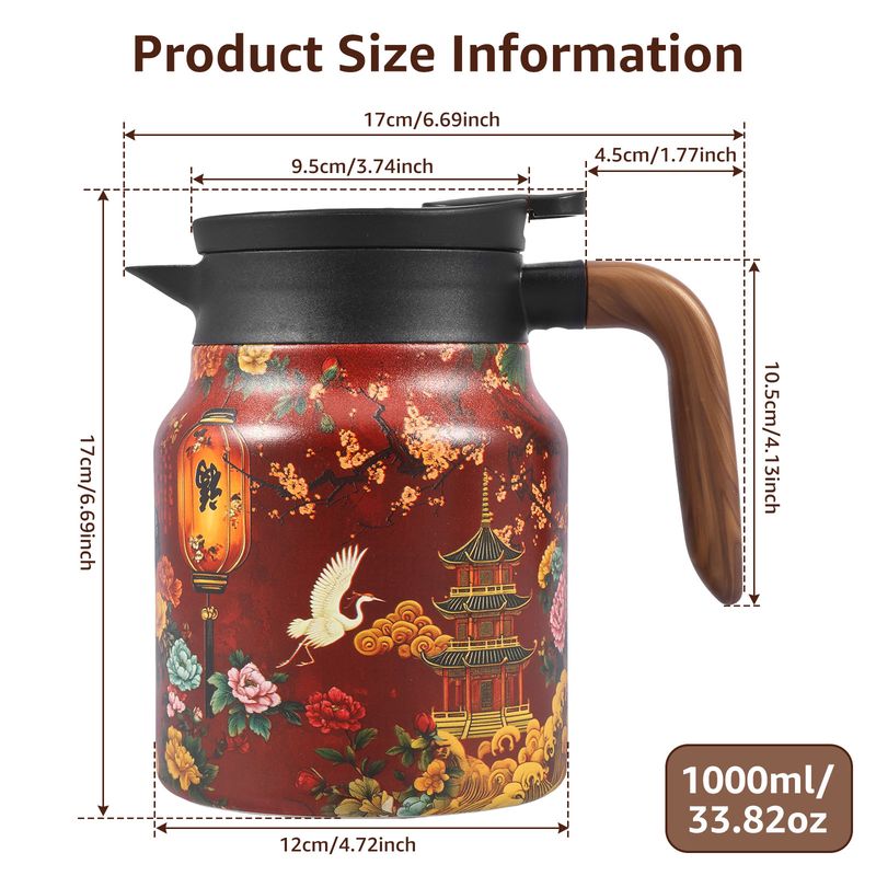 Stainless Steel Insulated Tea Pot 1000 ml/33.82 oz Vintage Flower Pattern Tea Kettle with Wood Handle and Built In Infuser for Home Office