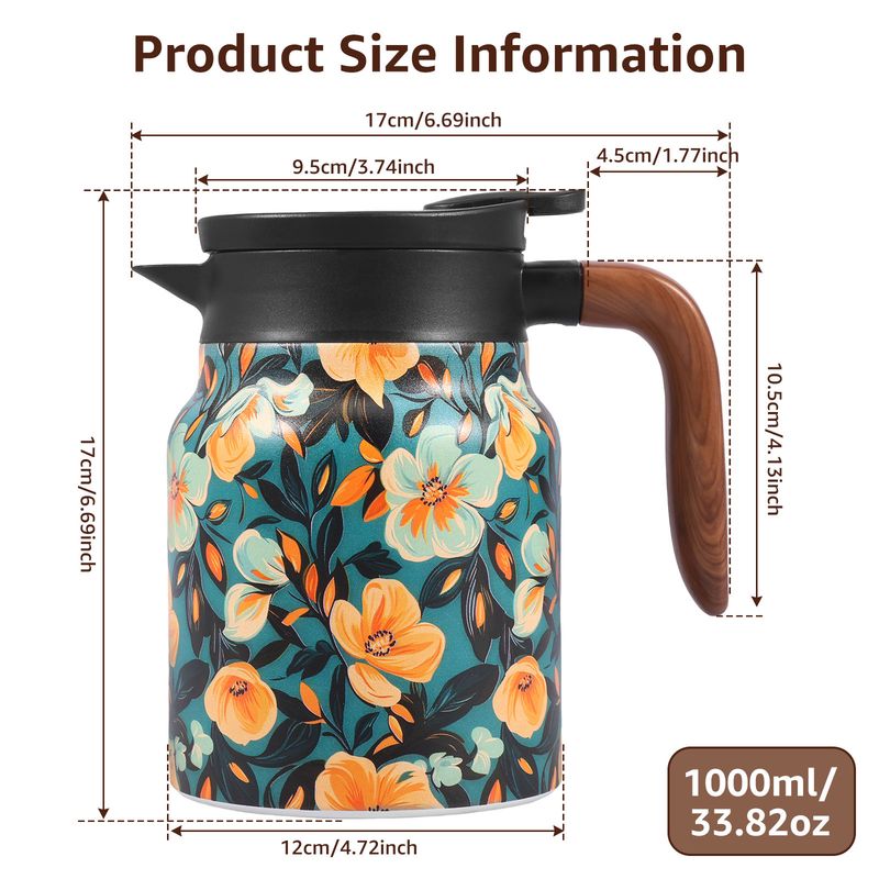 Stainless Steel Insulated Tea Pot 1000 ml/33.82 oz Vintage Flower Pattern Tea Kettle with Wood Handle and Built In Infuser for Home Office