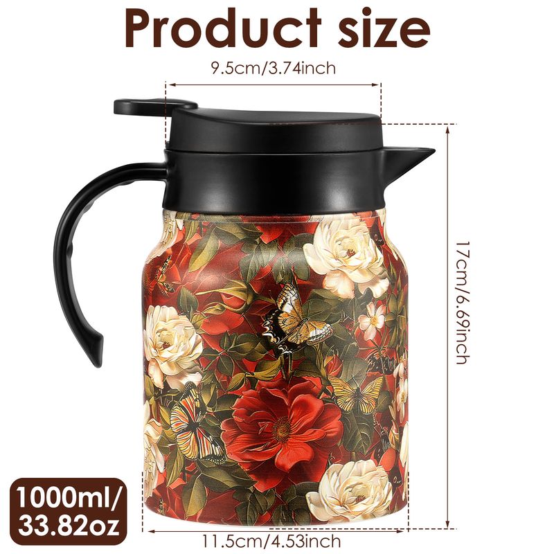 Stainless Steel Insulated Tea Pot 1000 ml/33.82 oz Vintage Flower Pattern Tea Kettle with Wood Handle and Built In Infuser for Home Office