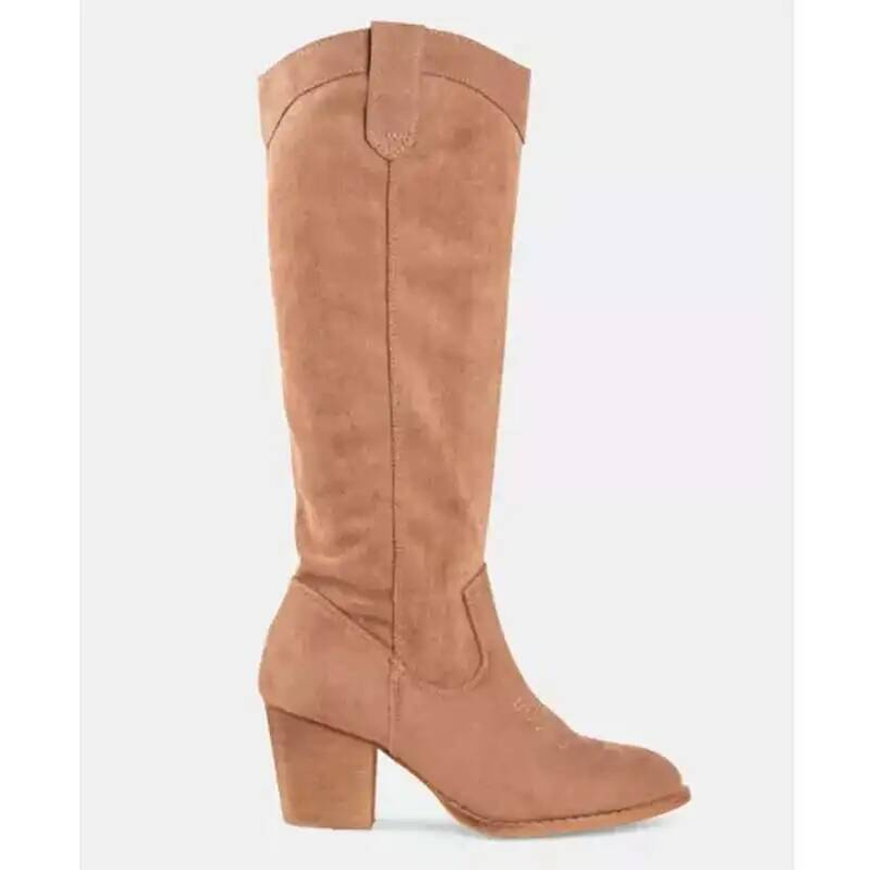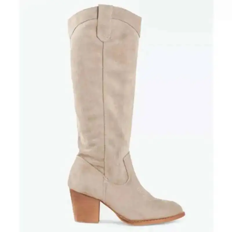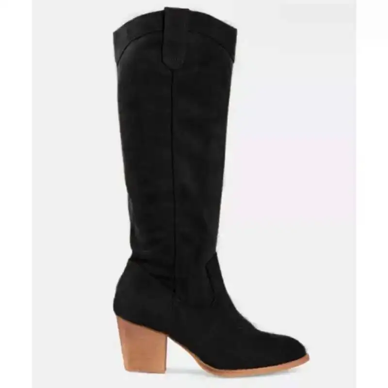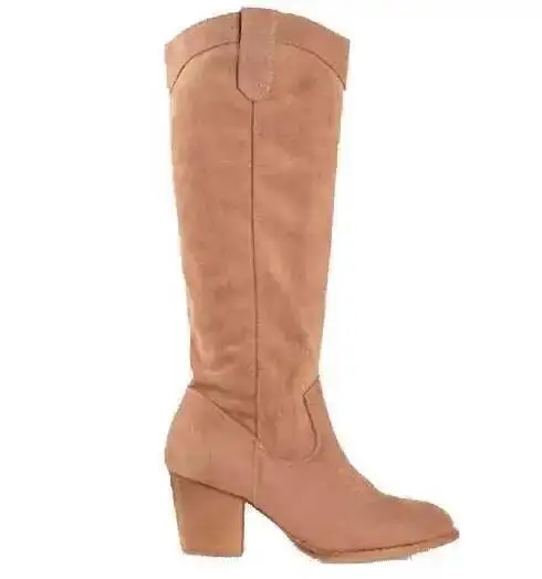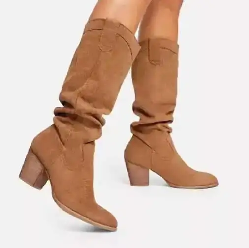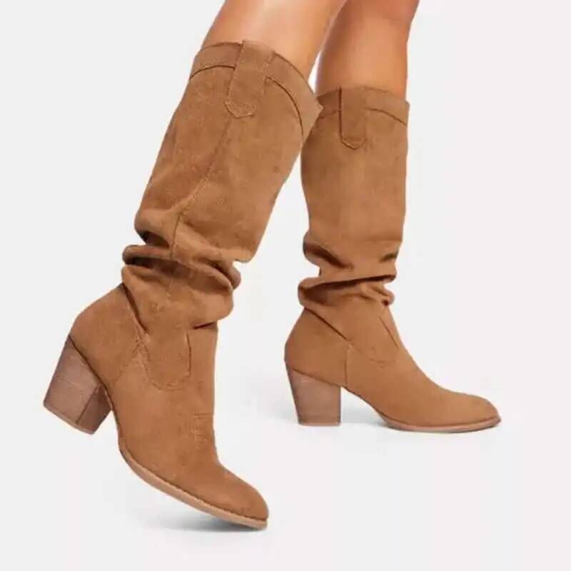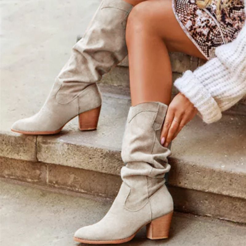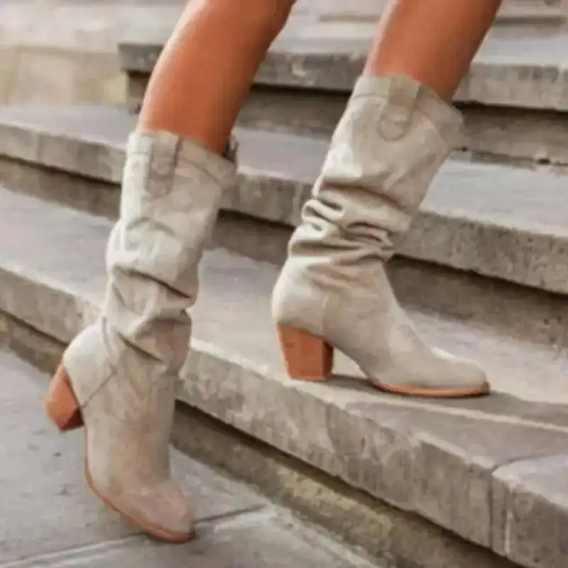 Vintage Pleated Boots Suede Chunky Heels Pointed Toe Women's Mid-Calf Boots
