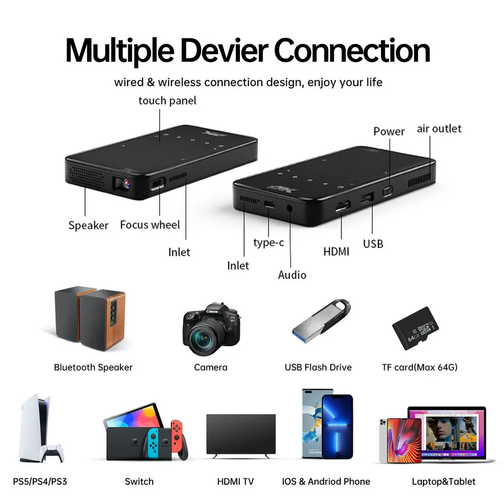 Vivicine Newest Mini Smart Mobile 4K 3D Projector HD Phone Size Projectors Build in Battery 2G RAM 32G ROM Wireless Airplay Miracast