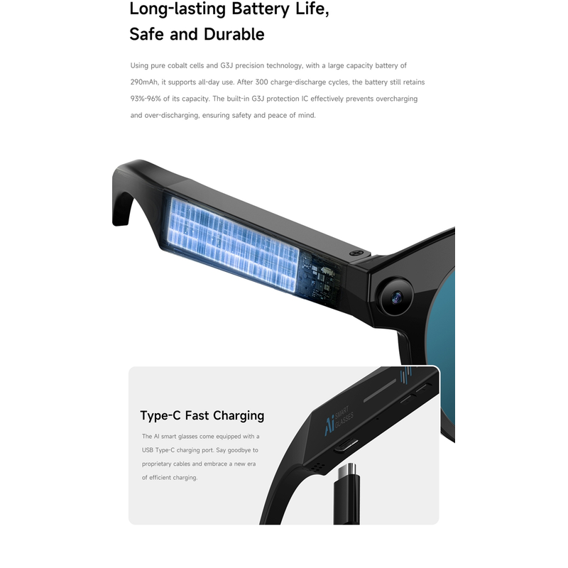 Main Features: AI voice assistant/photo taking/video recording/audio recording/music control/calling/alert sounds/indicator lights/translation/object recognition/touchscreen/music playback (music control, local music) etc.
