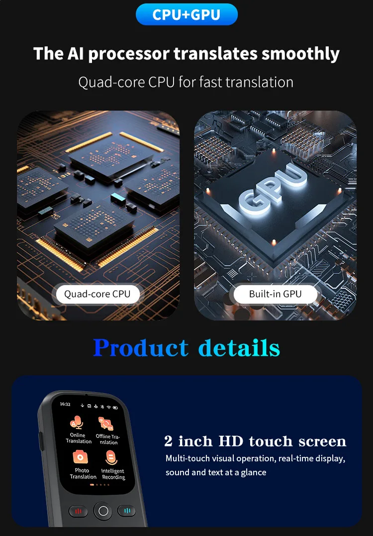 â–¶ Powerful Performance: Equipped with a quad-core ARM Cortex â„¢ -A7 processor running at 1.2GHz, our Translation Device delivers a quick and smooth translation experience. Whether you're engaging in live conversations or translating texts, this device provides reliable and efficient performance.