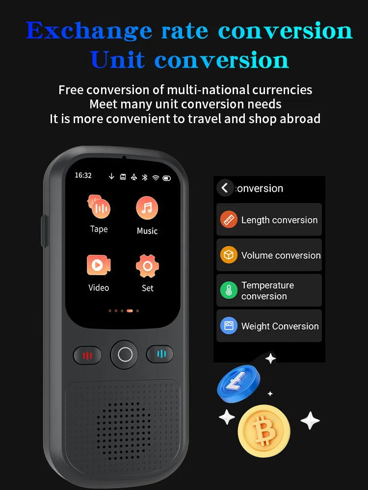â–¶ Enhanced Functionality: Capture important moments with the built-in 5MP camera that supports rear shooting and automatic focusing. The high-definition 2-inch capacitive touchscreen ensures clear display of translated content. Additionally, this device supports video/audio recording, clock function display, music playback, and instant conversion of up to 25 currency exchange rates, catering to diverse needs.