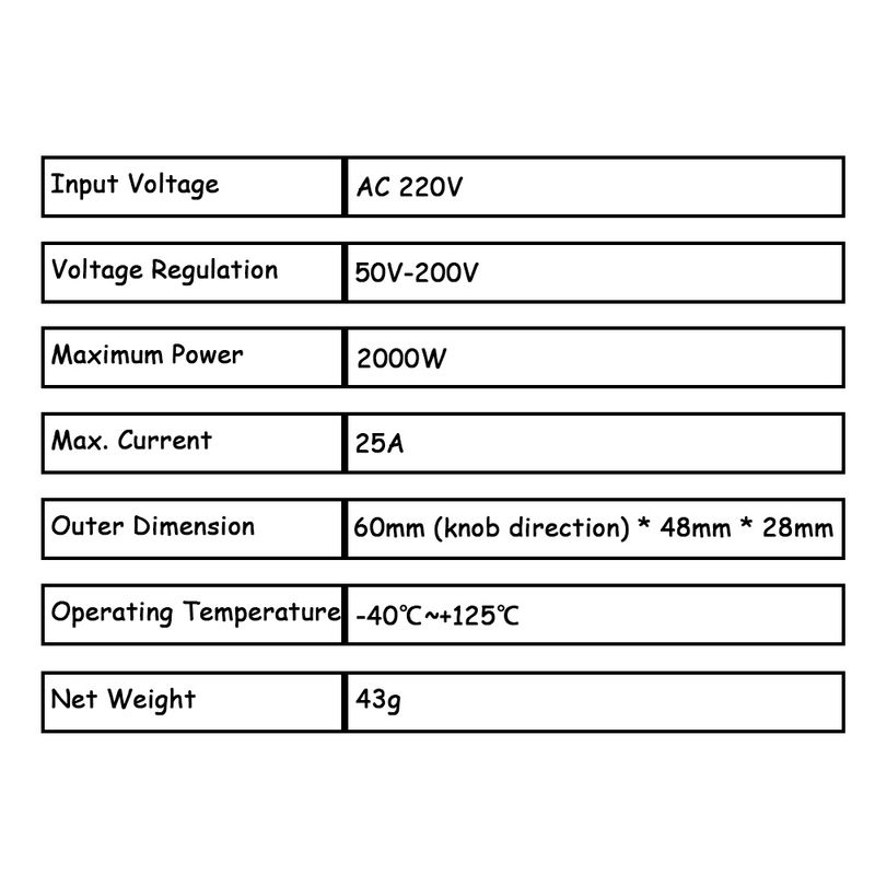-The voltage regulating range:50V-250V AC (Output voltage <= Input supply voltage)