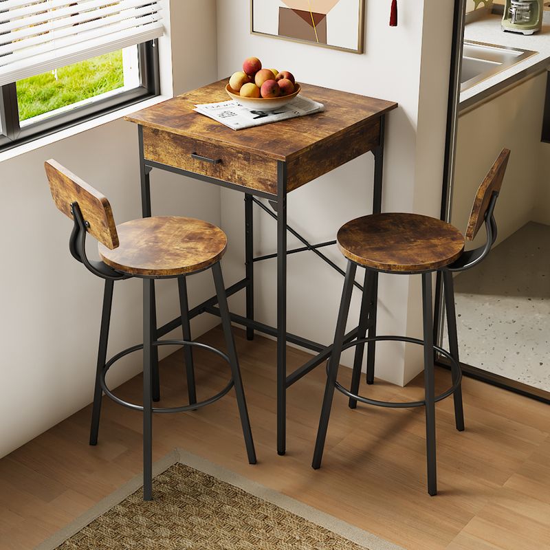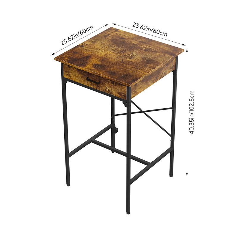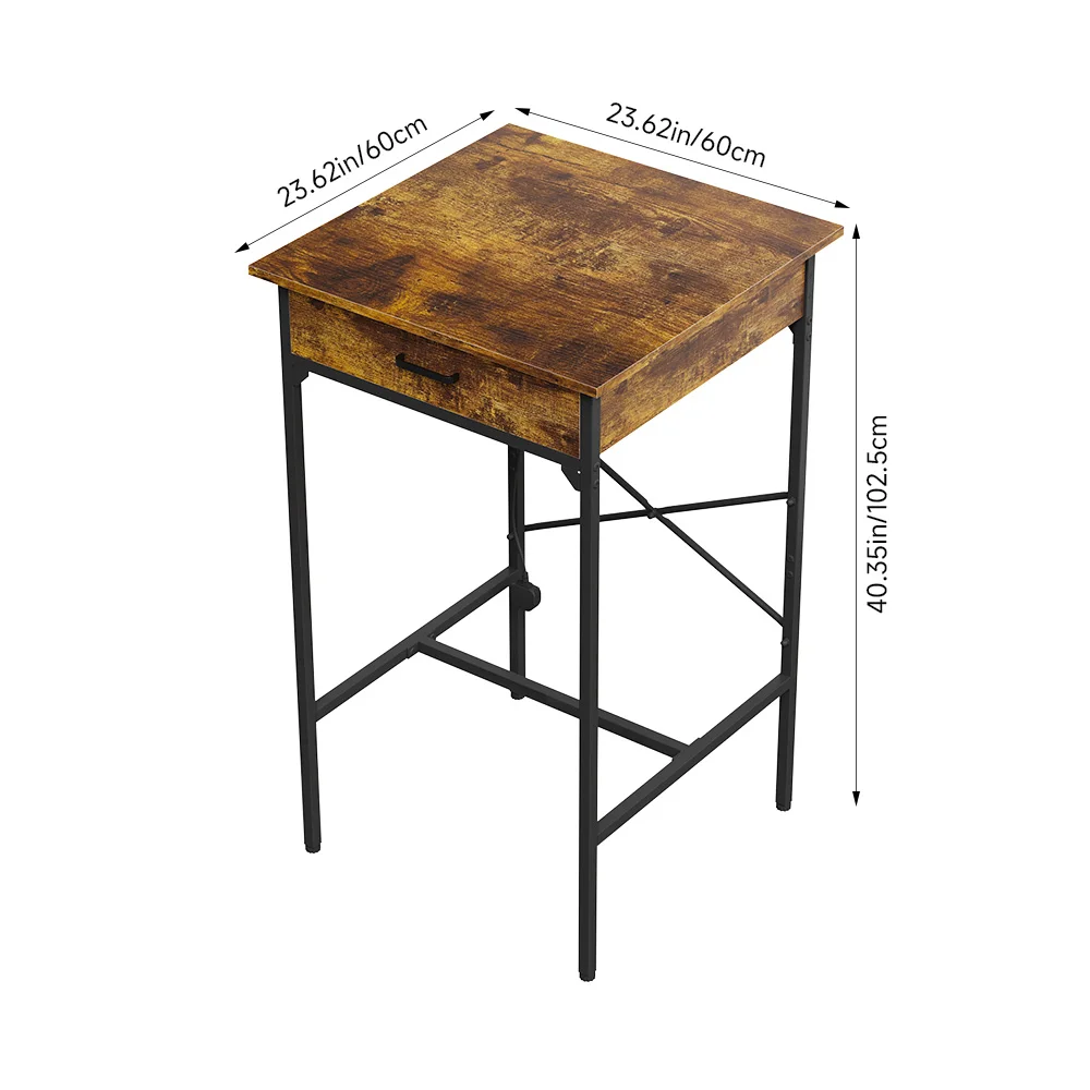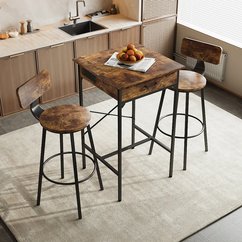 This rustic-style bar table combines clean lines with modern functionality, featuring a built-in charging station that adds contemporary convenience. Its wood grain texture brings warmth and charm to any space. The single drawer with a sleek black handle offers discreet storage for personal items, while the integrated charging station—equipped with two AC outlets and two USB ports—makes it easy to power your phone, tablet, and other devices. More than just a charging nightstand, it also functions effortlessly as a side table or sofa-side console, ideal for the bedroom, living room, or office.