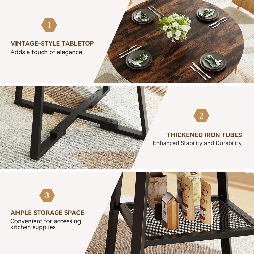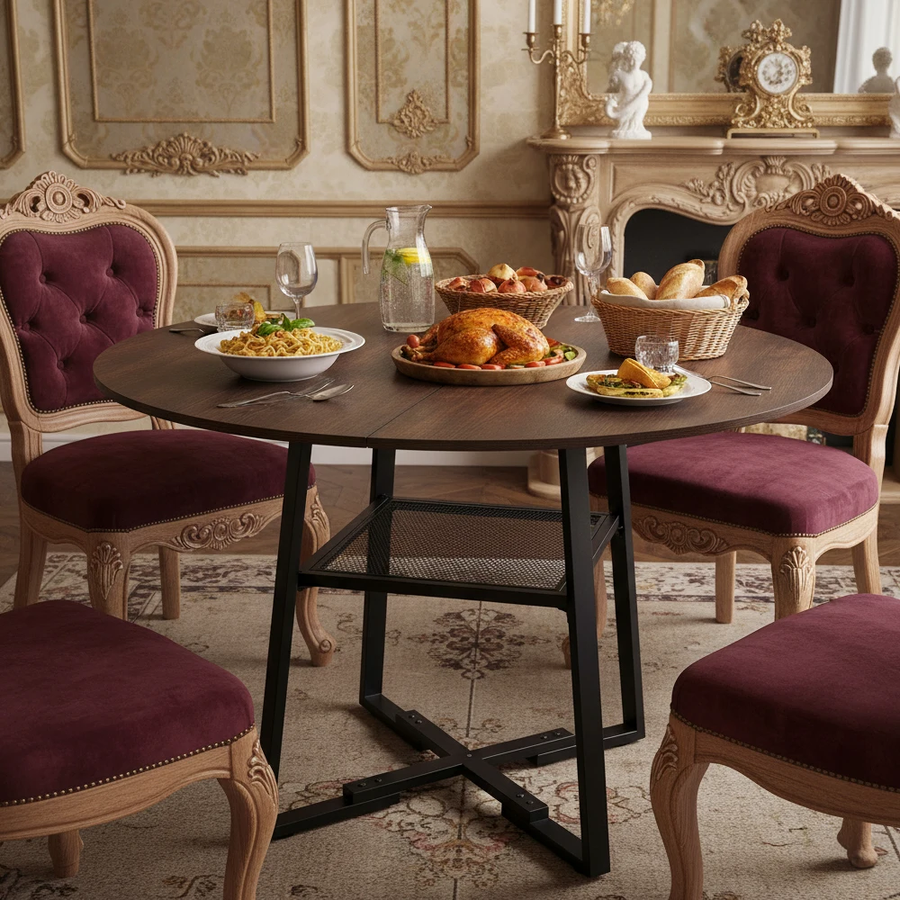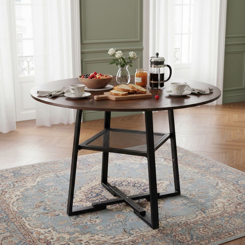 This round dining table blends style with practicality, serving as an inviting centrepiece for meals and gatherings. Its spacious tabletop encourages comfortable conversation, while the smooth, scratch-resistant surface ensures safety and durability. The lower shelf offers convenient storage for dinnerware, décor, or daily essentials, keeping your space organised. Finished with a warm wood-effect top and sleek black metal frame, it showcases modern industrial charm. Perfect for family meals or weekend hosting, this table delivers both function and character to any dining area.