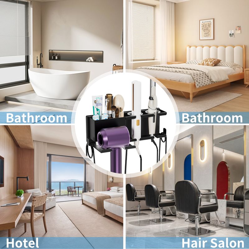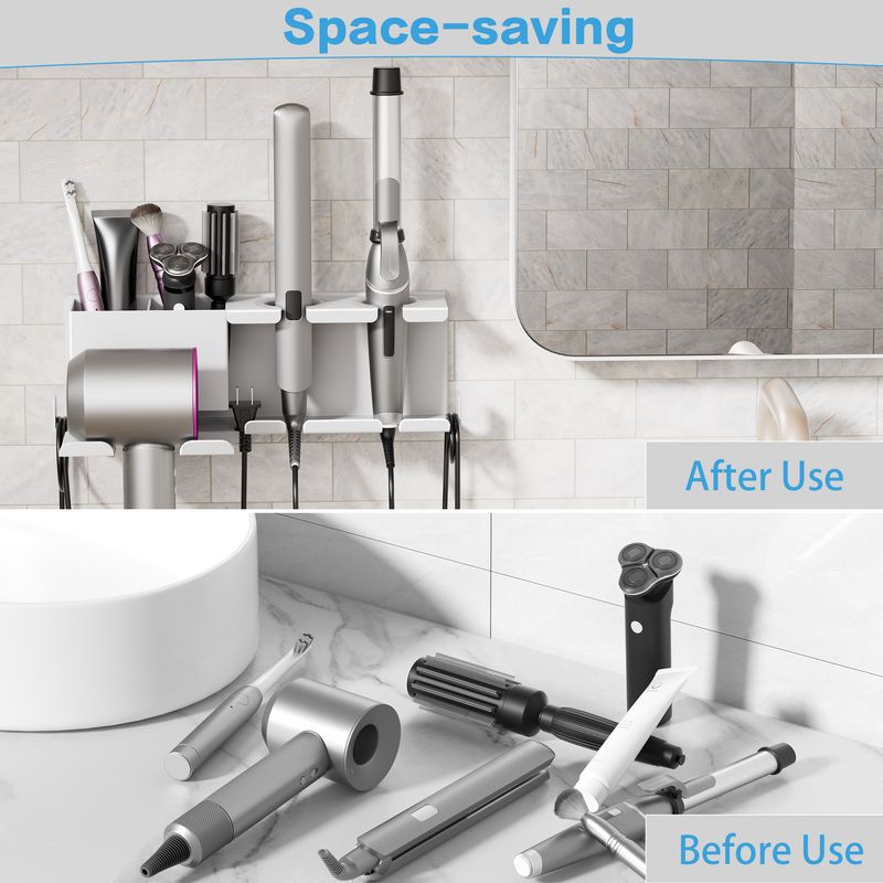 Space-Saving & Multi-Functional Storage: Featuring a sleek wall-mounted design, this hair tool organizer takes up minimal space while providing ample storage. It includes a hook for hanging your blow dryer and additional space for curling irons, straighteners, and other hair tools, keeping your bathroom or salon neatly organized.