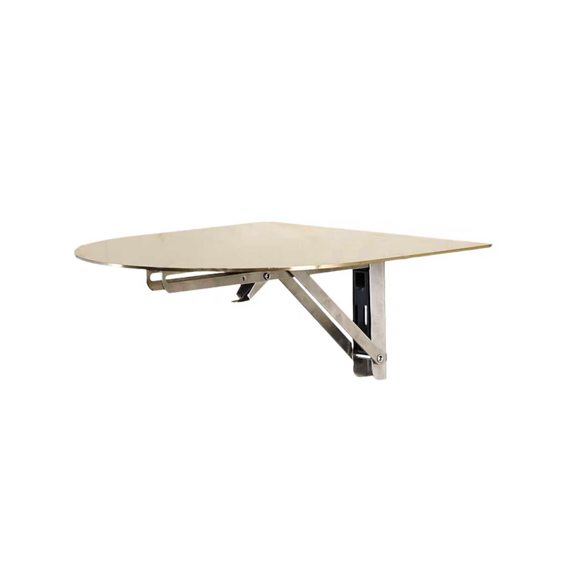 Space-saving wall mounted stainless steel folding table with round design.