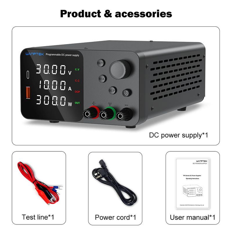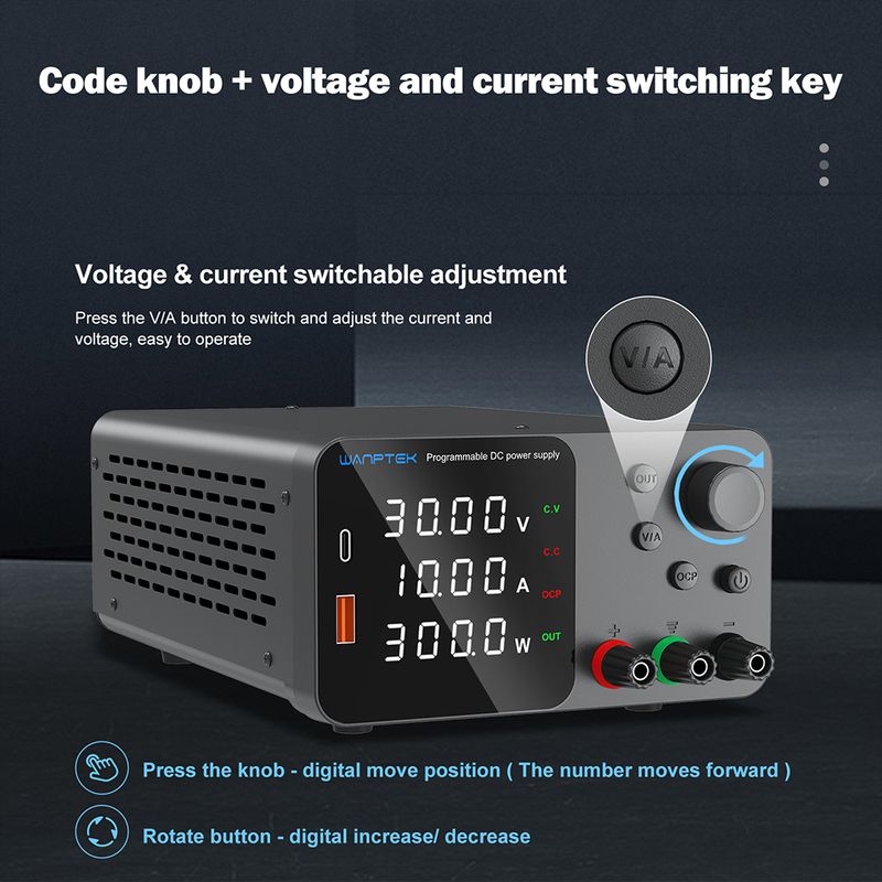 Wanptek's new series products. This model is a miniature switching DC power supply. The output voltage and current can be controlled and adjusted Encoder adjustment, so it provides more convenience and accuracy in the adjustment of voltage and current. The panel also provides high-precision two/three-window digital tube display of voltage, current and power(optional), so that users can intuitively see the current use status and various parameters of the machine