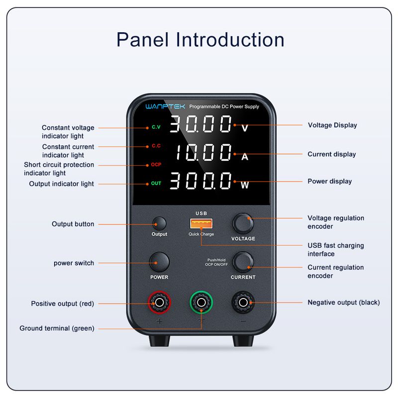Wanptek's new series products. This model is a miniature switching DC power supply. The output voltage and current can be controlled and adjusted by variable resistors respectively, so it provides more convenience and accuracy in the adjustment of voltage and current. The panel also provides high-precision two/three-window digital tube display of voltage, current and power, so that users can intuitively see the current use status and various parameters of the machine