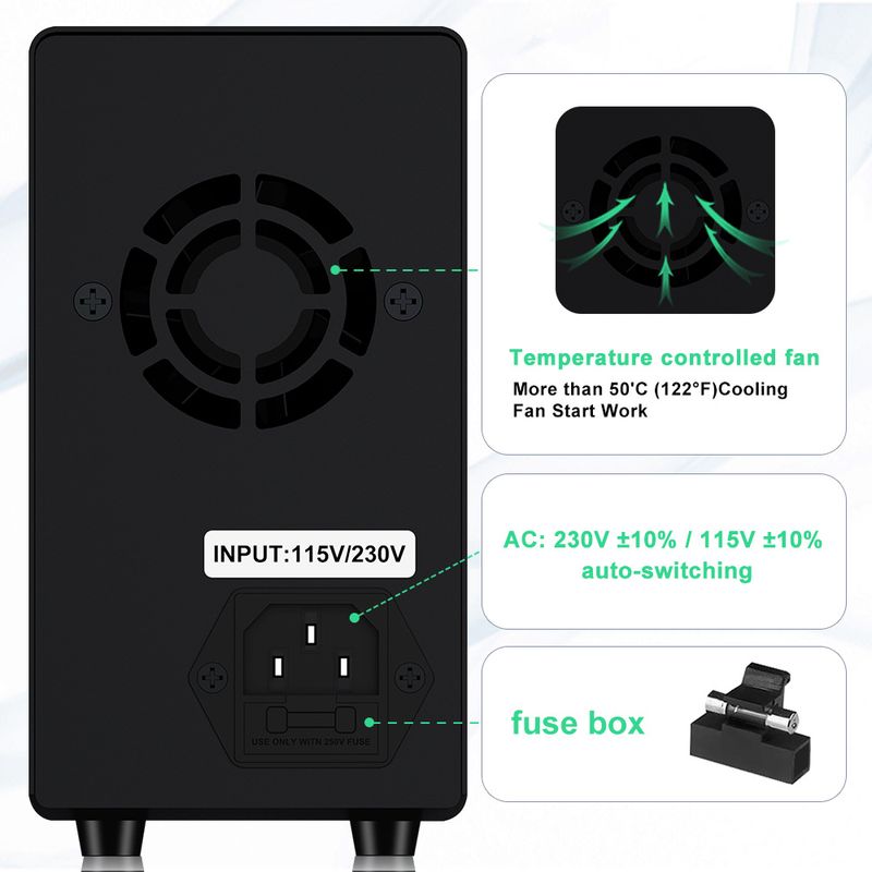 GA series products are four-window dual-color digital display switching DC regulated power supply with USB fast charging output display, can display voltage and current at the same time. The products are widely used in cell phone repair, computer repair, battery charging, school teaching and production line use.GA series products use encoder potentiometer can be continuously adjusted between 0 and nominal value output voltage and output current, can be pre-displayed set value, easy to use and adjust. This machine has USB fast charging interface with output display, support a variety of fast charging protocol. It has perfect short circuit protection circuit. The stability and ripple coefficient of the power supply are very good, its small size, light weight, beautiful design, easy to operate, full load can work for a long time, loved by users.
