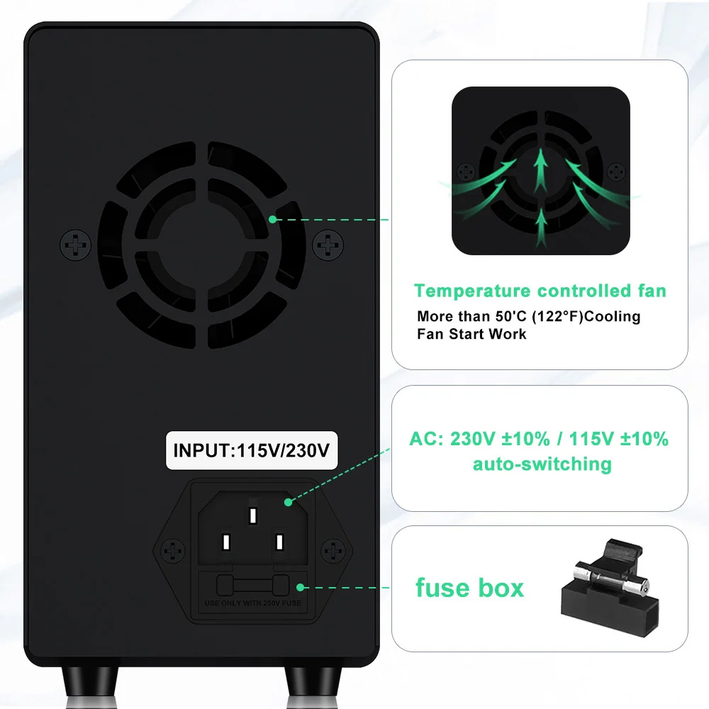 GA series products are four-window dual-color digital display switching DC regulated power supply with USB fast charging output display, can display voltage and current at the same time. The products are widely used in cell phone repair, computer repair, battery charging, school teaching and production line use.GA series products use encoder potentiometer can be continuously adjusted between 0 and nominal value output voltage and output current, can be pre-displayed set value, easy to use and adjust. This machine has USB fast charging interface with output display, support a variety of fast charging protocol. It has perfect short circuit protection circuit. The stability and ripple coefficient of the power supply are very good, its small size, light weight, beautiful design, easy to operate, full load can work for a long time, loved by users.
