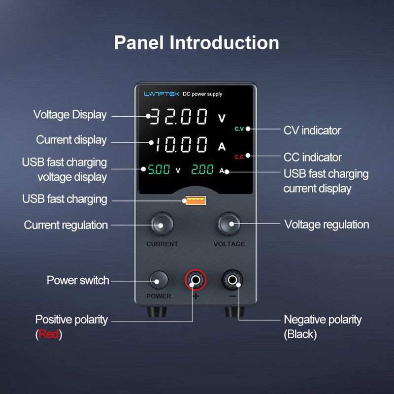 Wanptek's new series products. This model is a miniature switching DC power supply. The output voltage and current can be controlled and adjusted Encoder adjustment, so it provides more convenience and accuracy in the adjustment of voltage and current. The panel also provides high-precision two/three-window digital tube display of voltage, current and power(optional), so that users can intuitively see the current use status and various parameters of the machine