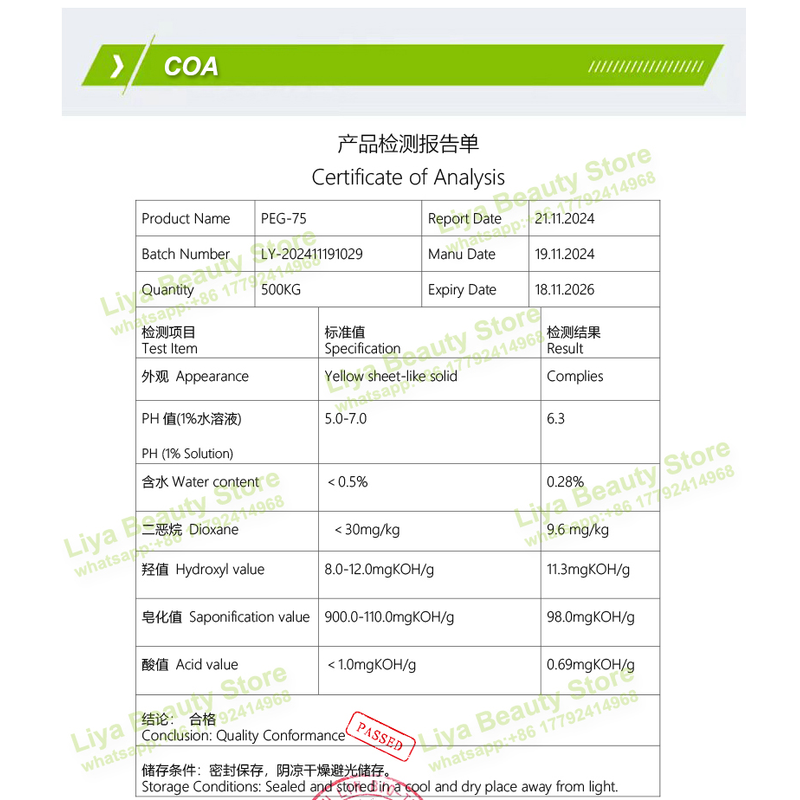 Recommended use levels range from 0.5% to 5.0%, depending on application. When used in solutions, PEG-75 LANOLIN should first be melted, followed by addition of 3 times the amount of hot water under constant stirring. The resulting concentrate is then diluted with either hot or cold water. In order to prepare emulsions, PEG-75 LANOLIN is normally melted together with the oil phase, but it can also be dissolved in the aqueous phase. It should be stored cool in closed containers. Prolonged heating above 80 °C should be avoided.