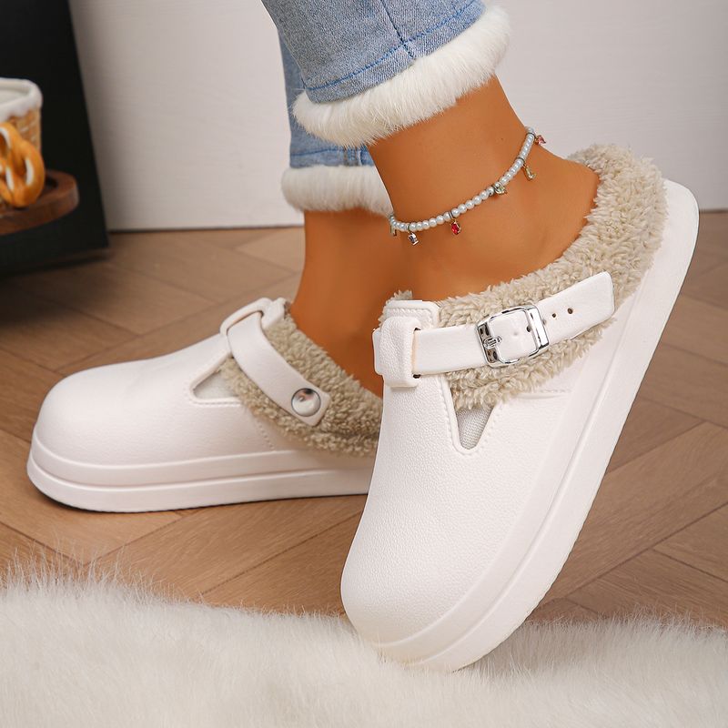 Waterproof Eva Furry Mules Slippers Women 2025 Winter Metal Buckle Warm Plush Slippers Soft Thick Bottom Non Slip Indoor Slides