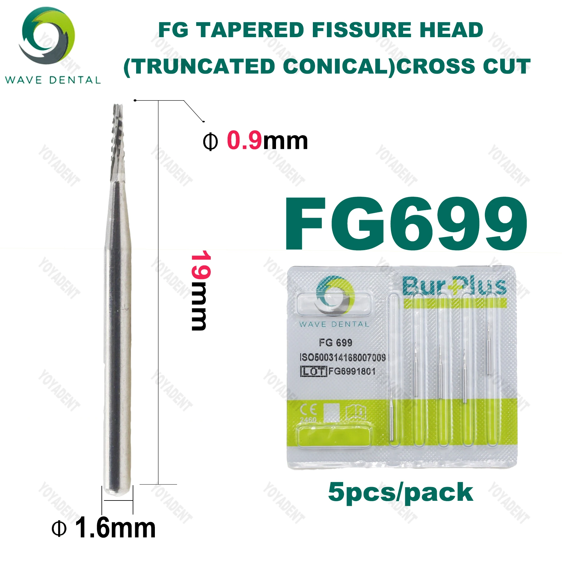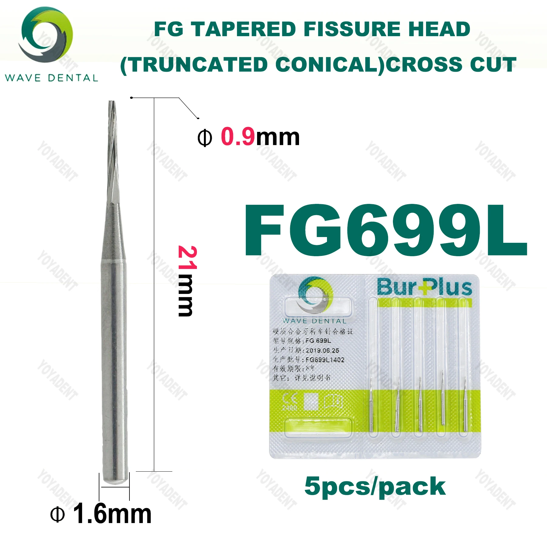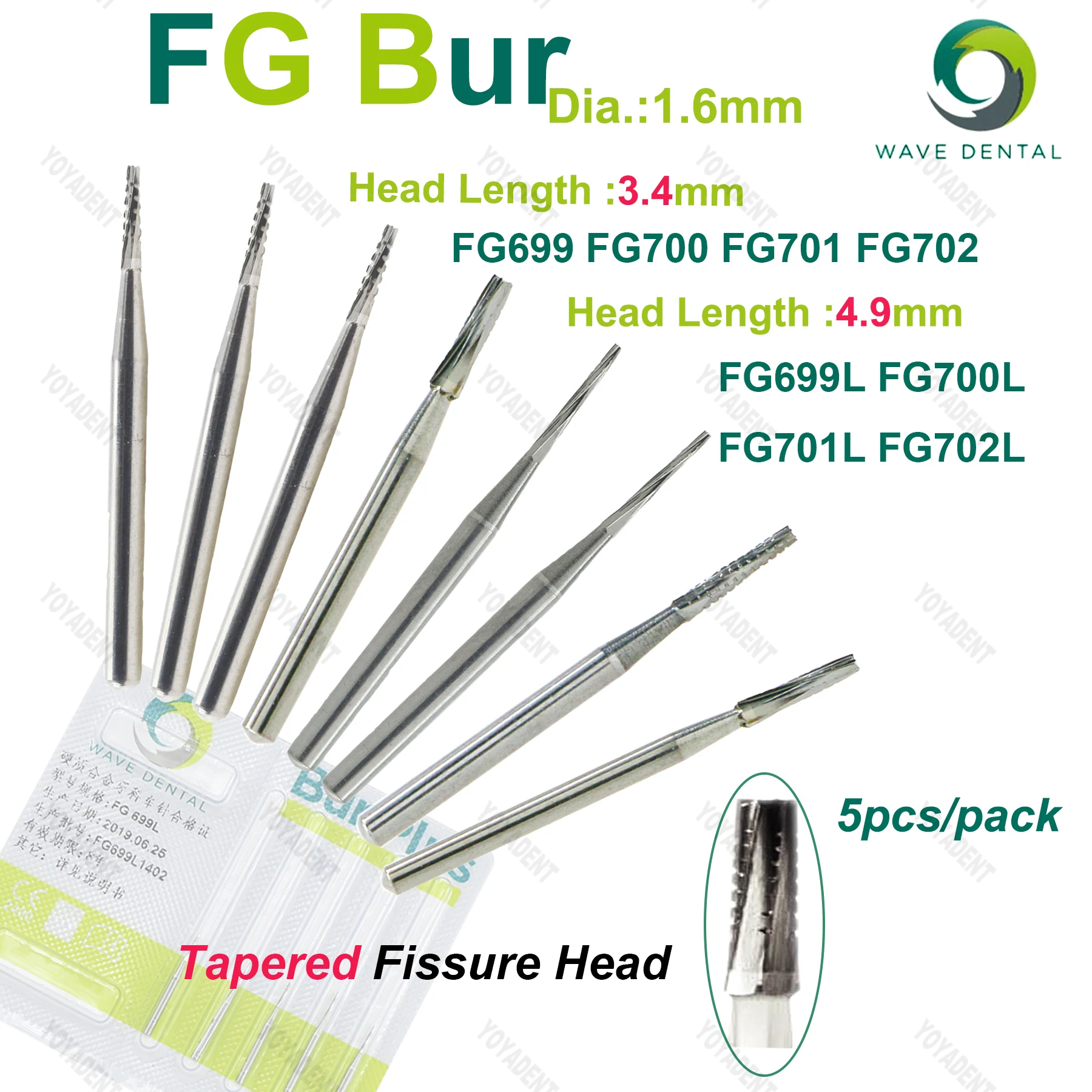 WAVE Dental Drill Tungsten Carbide Bur Tapered Fissure Head FG For High Speed Handpiece Head Dia 0.9 to 1.6mm 5Pcs/pack