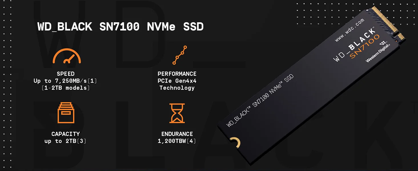 Get ready to game even faster with the WD_BLACK SN7100 NVMe™ SSD, featuring up to 7250MB/s read and 6,900MB/s write speeds (1-2TB models), providing up to a 35% performance boost over the previous generation SSD. Engineered with laptops and gaming handhelds in mind, obliterate load times and conquer your heftiest gaming sessions with improved power efficiency at maximum speed. Store more games and still have room for future updates and DLC, with capacities up to 2TB. Upgrade now and ensure you’re ready for the rigors of AI applications and next generation gaming.High-octane gaming SSD that doesn’t back down