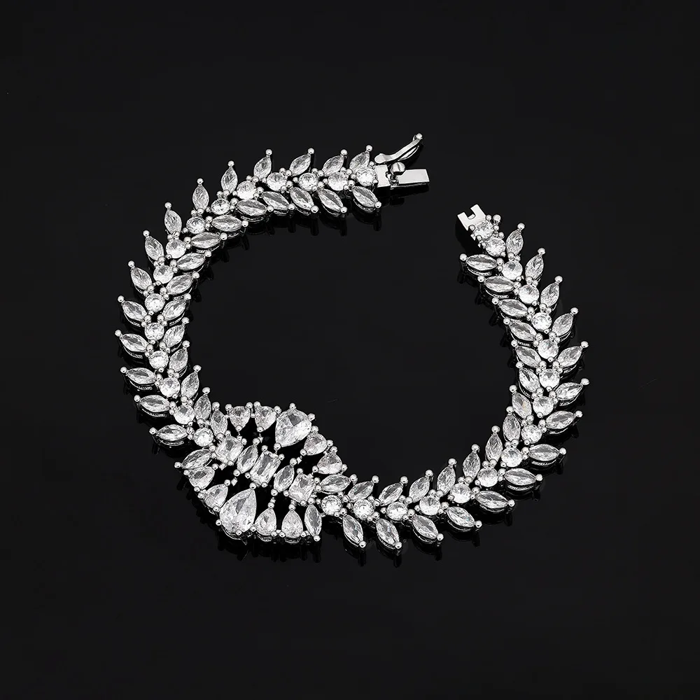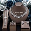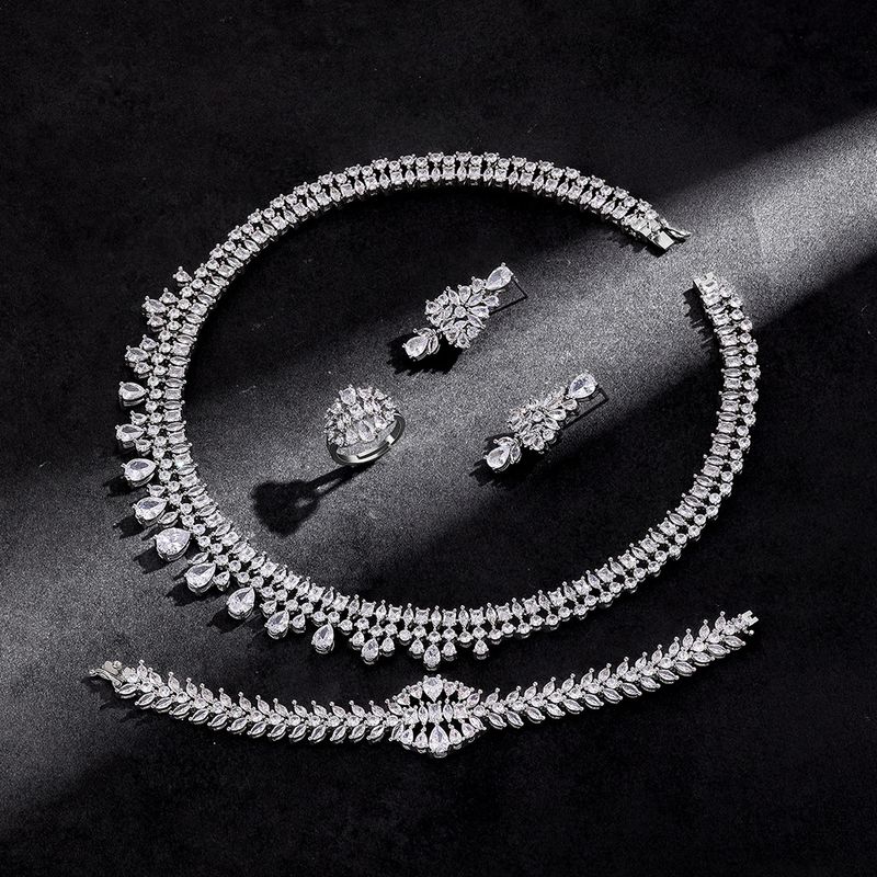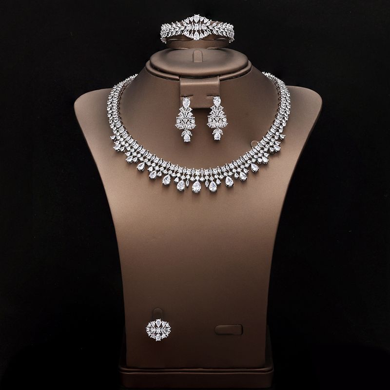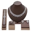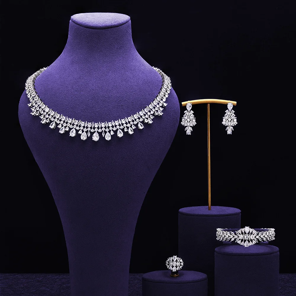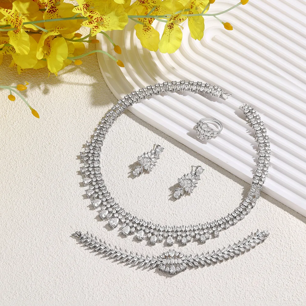 This comprehensive set includes earrings, necklace, and bracelet, providing a complete look for any event.