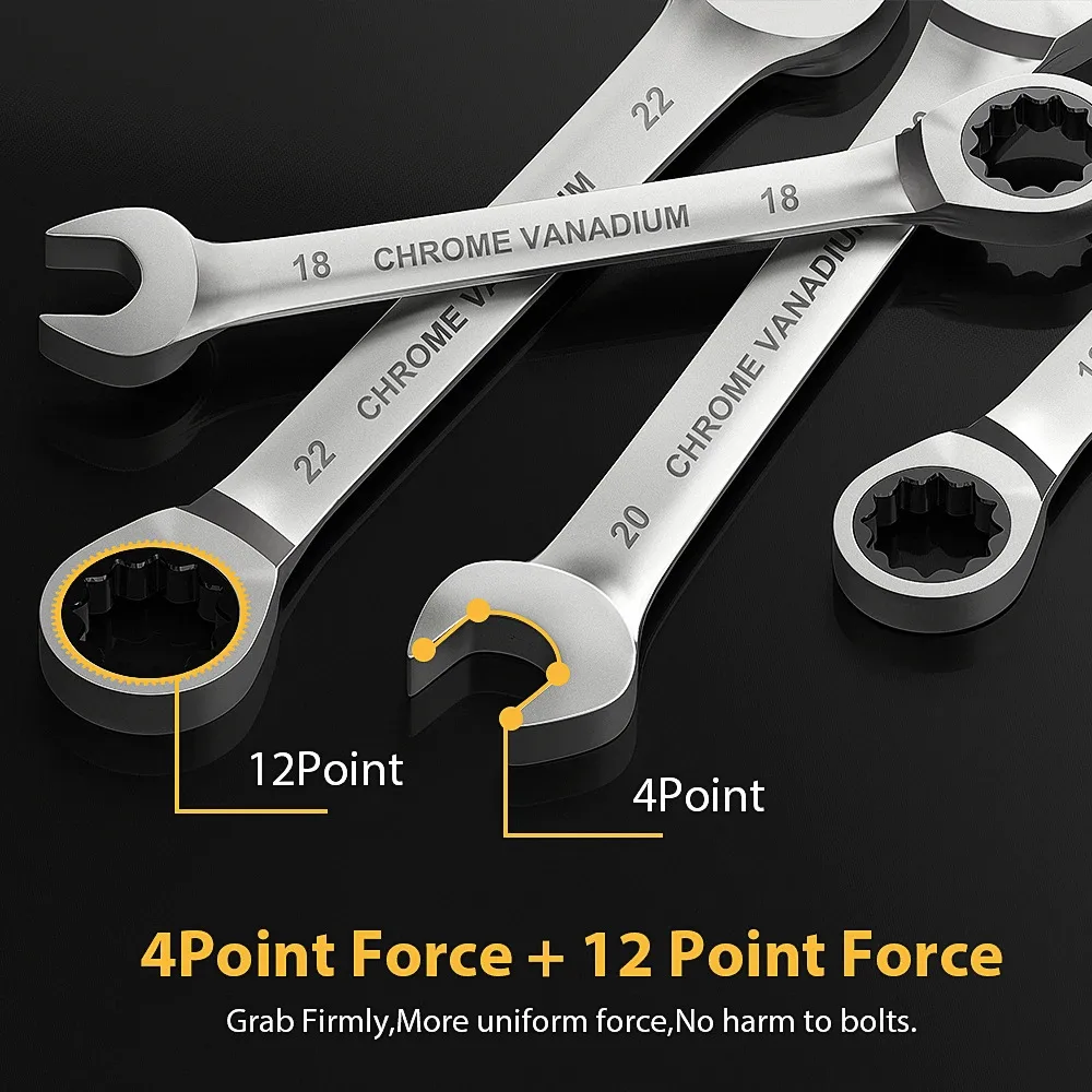 【HIGH QUALITY MATERIAL】Mirror polished wrench set is made of heat-treated chromium-vanadium steel with good toughness,waterproof and rustproof.Aerospace grade chromium-vanadium alloys are stronger,corrosion resistant and have a longer service life.