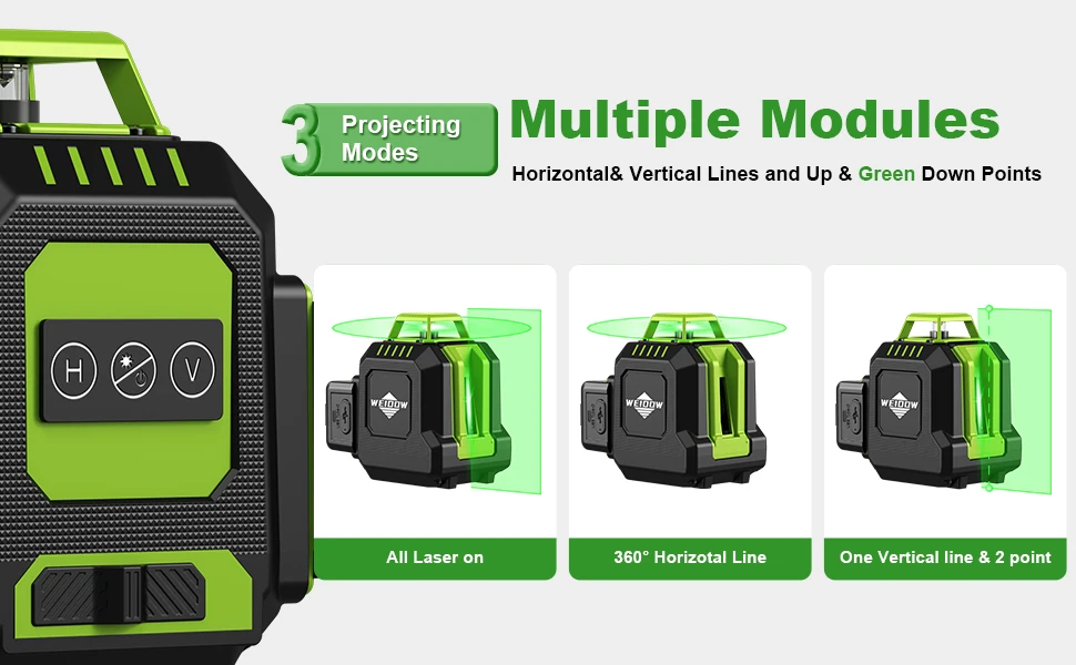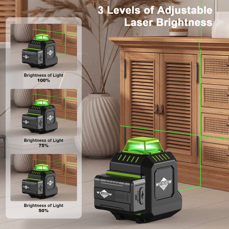 Laser Level 360° self-leveling uses an upgraded version of the chip, which can emit a total of 5 laser lines in the horizontal direction of 360° and the vertical direction of 120°, and can finish more than 95% of daily construction and homework projects. The accuracy of this laser level is + 0.03 inches at 23 feet , with a working range of up to 82 feet. At the same power, the brightness of the green laser beam is twice than that of the red laser.