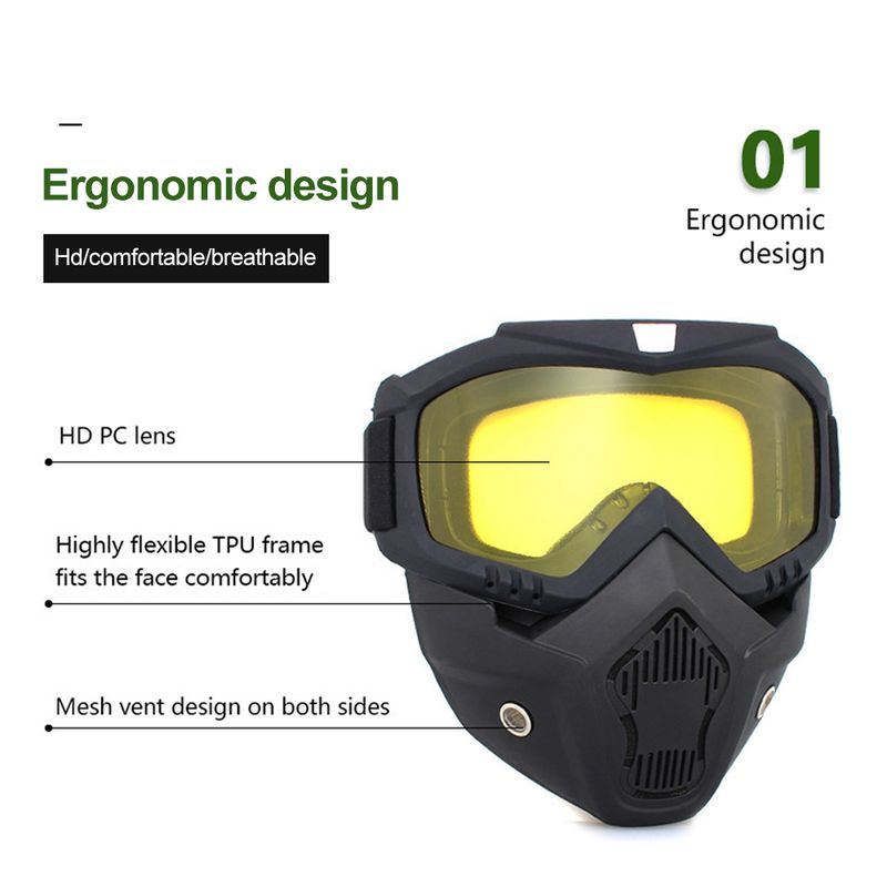 3.It has good foldable toughness and adopts aerodynamic design to maintain maximum air exchange; PC lens, high transparency, curved design, wide field of view, professional protection.