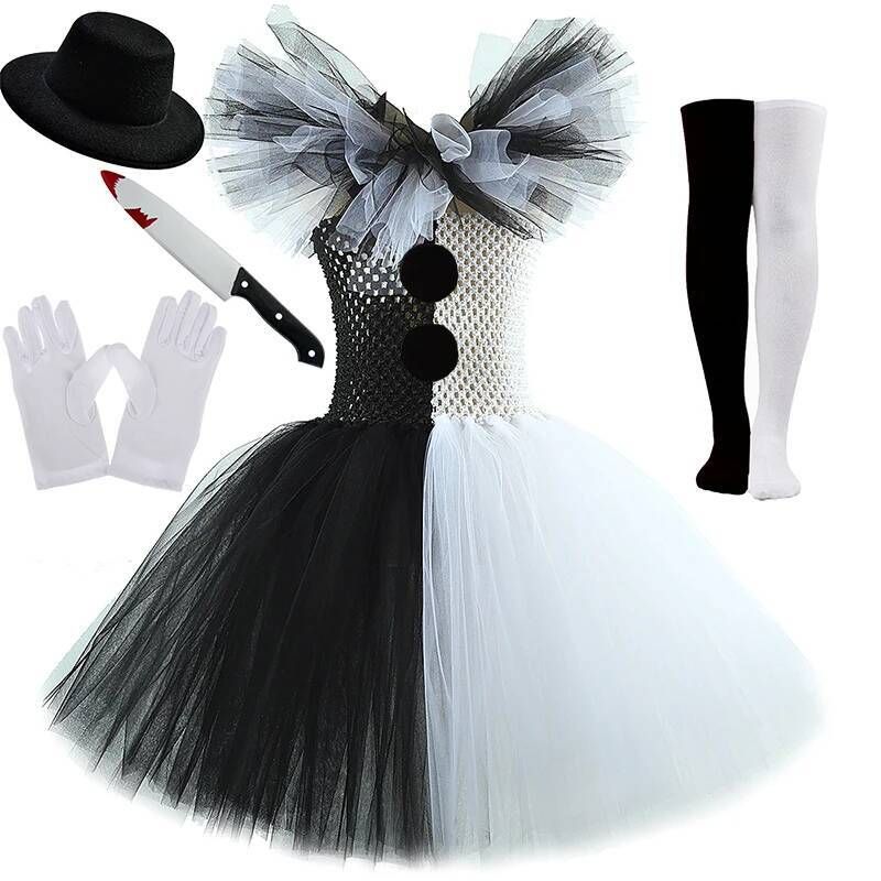 White Black Killer Clown Costumes for Girls Scary Halloween Carnival Fancy Dresses for Kids Creepy Ballet Tutus Outfit Clothing