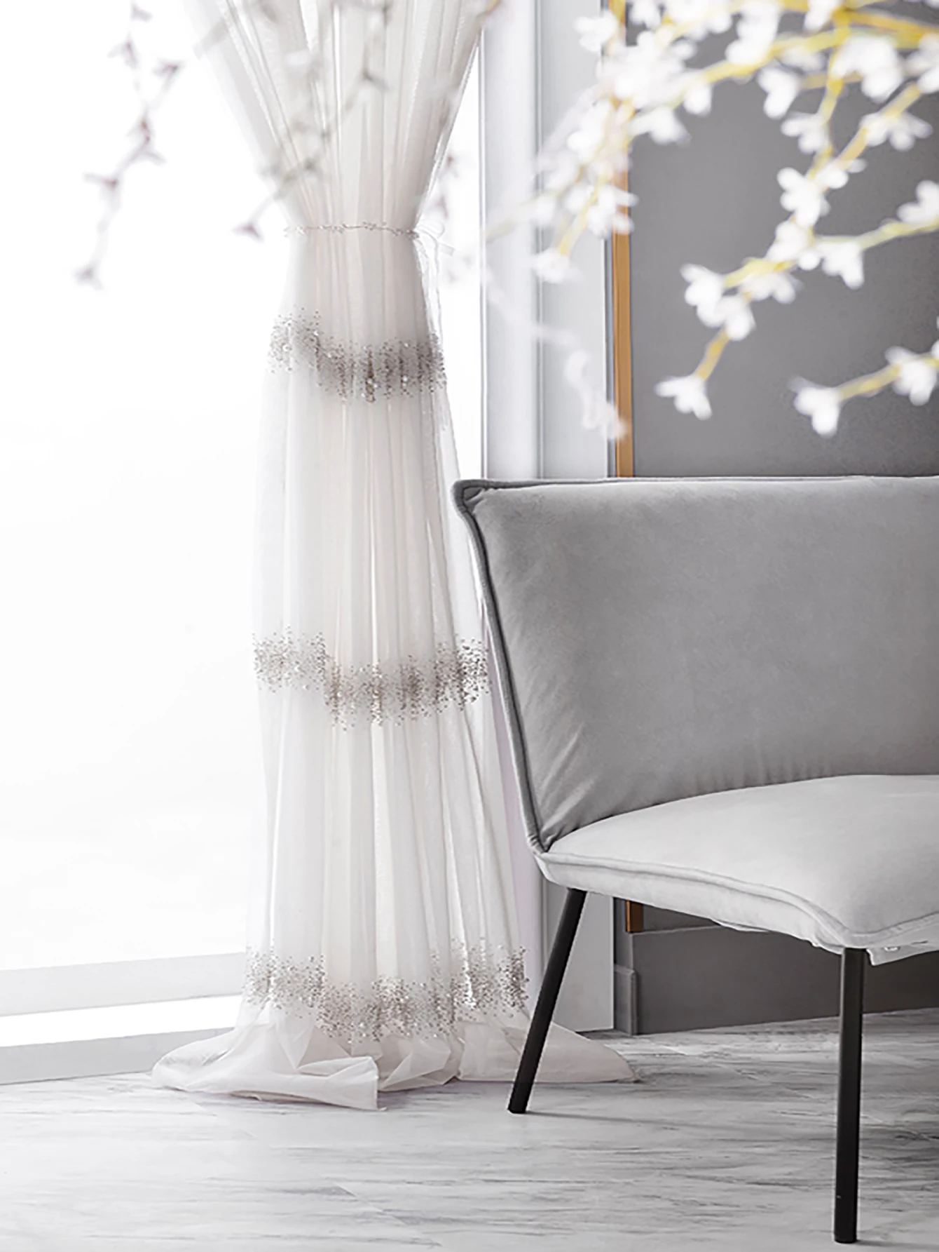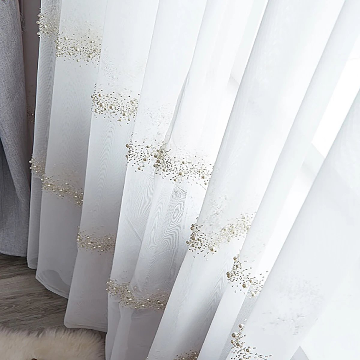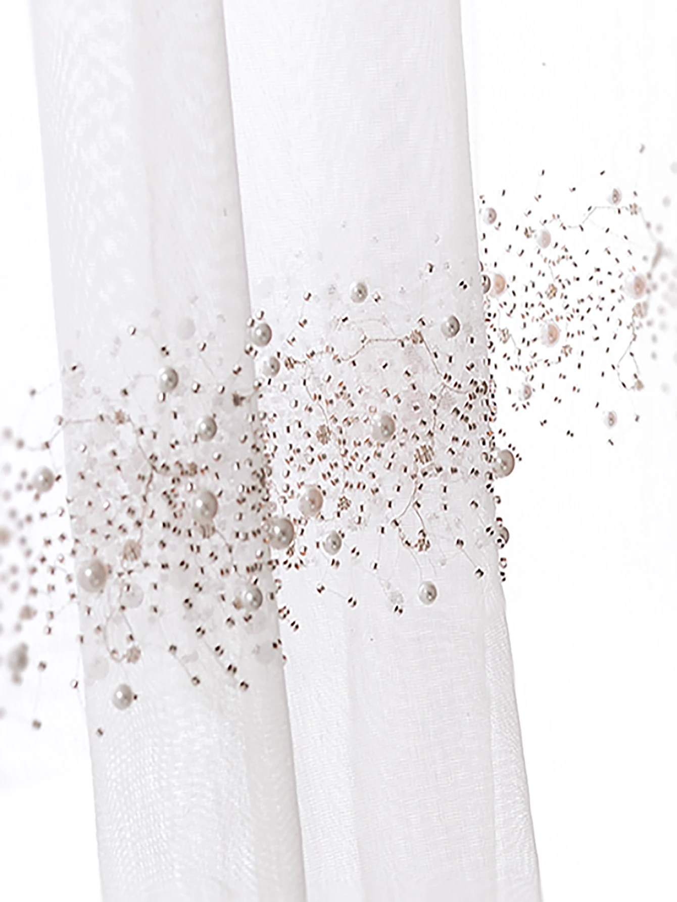 White Sheer Panel Curtain, Modern Polyester Faux Pearl Decor Light Filtering Privacy Sheer Curtain For Home