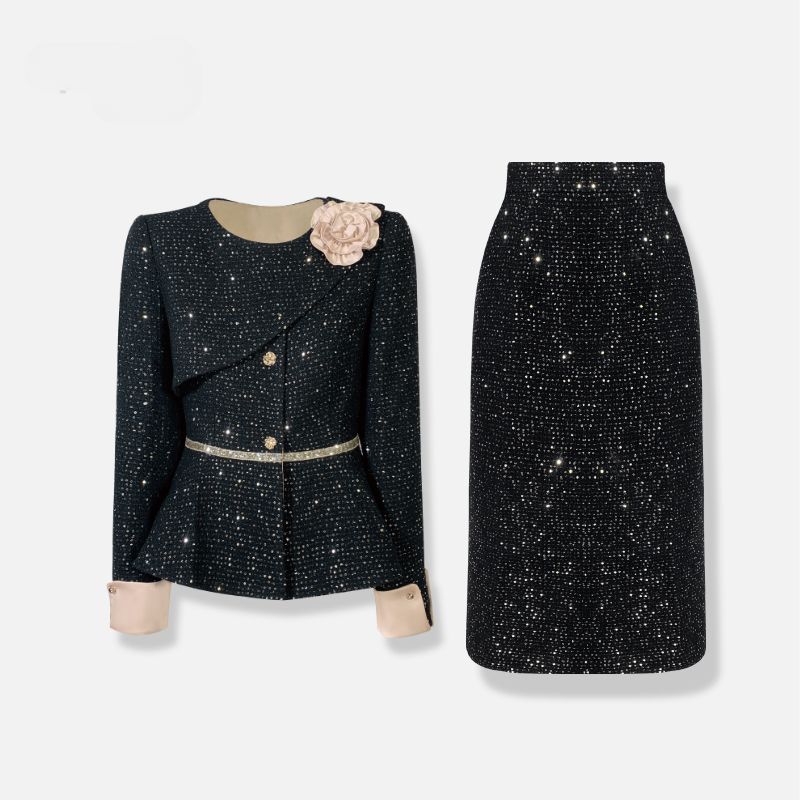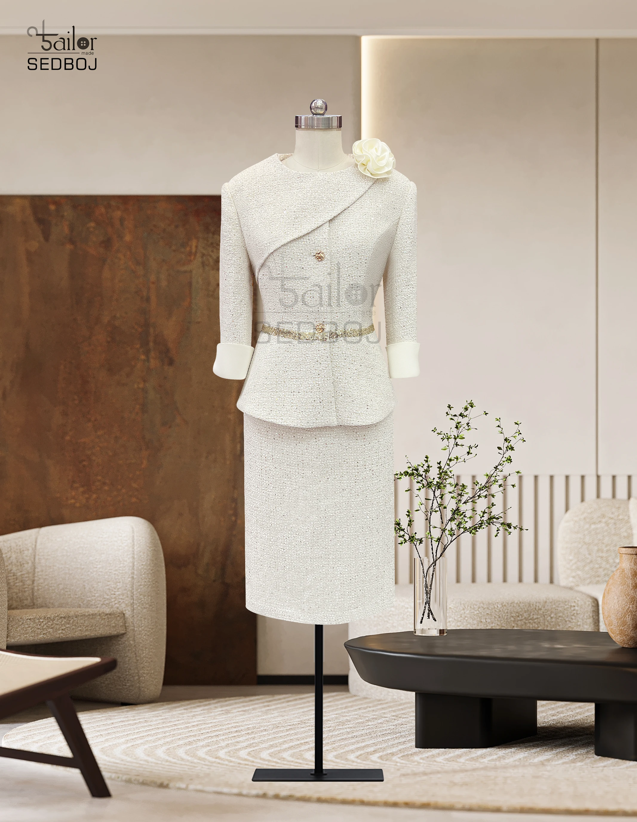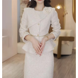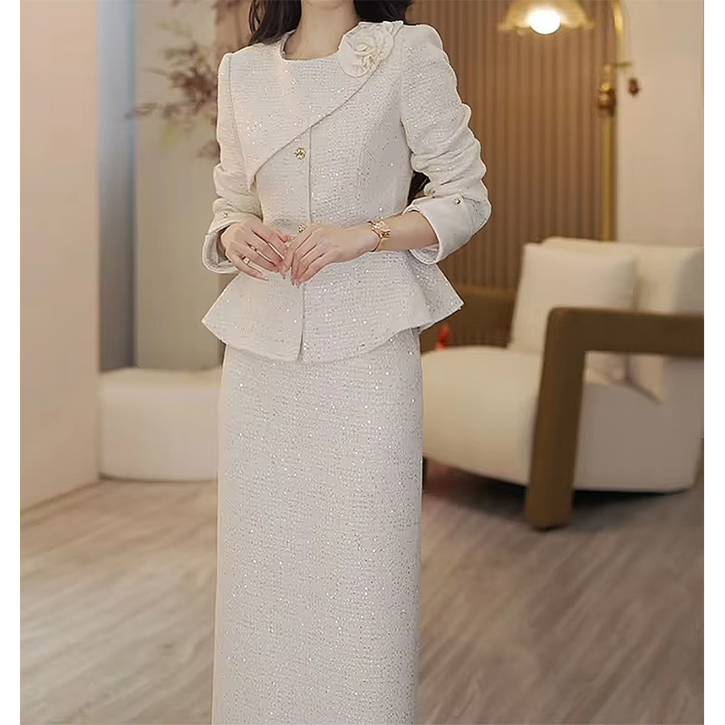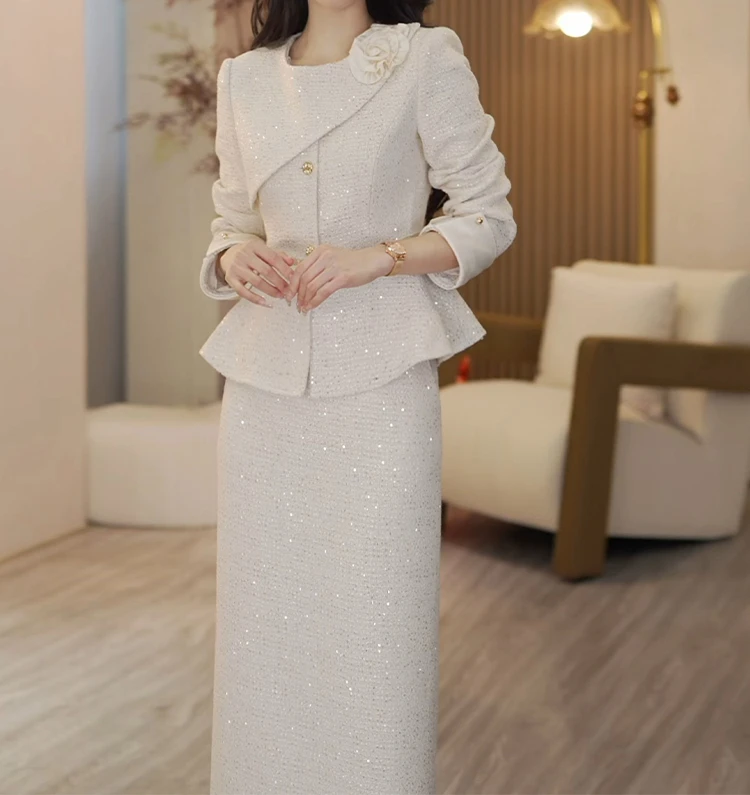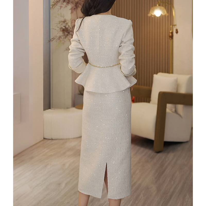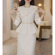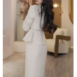 White Women's Jacket Skirt Set Waist Cinched Unique Beautiful Matching Top Bottom Ensemble