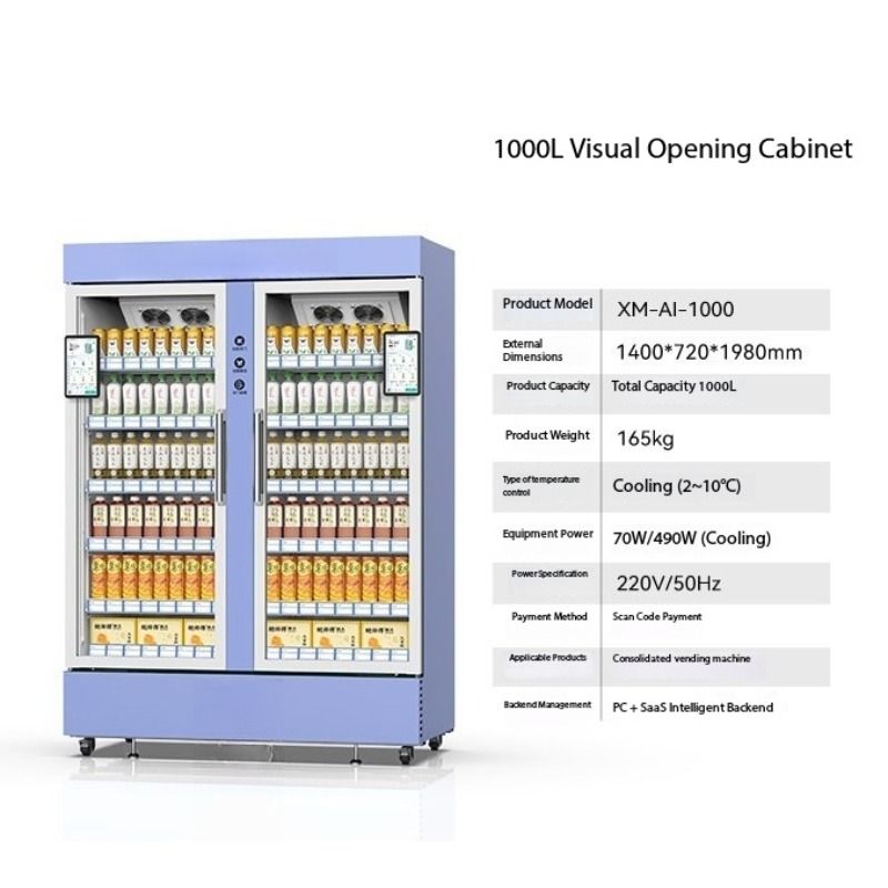 This AI vision open-door vending cabinet features intelligent visual recognition technology, allowing customers to open the door, pick up items, and close it for automatic checkout. It comes in 520L standard, 520L enhanced, and 1000L double-door models, with a 2–10°C cooling system and 360° air-cooling to keep products fresh. Backed by a PC+SaaS smart backend, it supports real-time inventory tracking, sales analytics, and unattended 24/7 operation, making it ideal for modern retail scenarios.