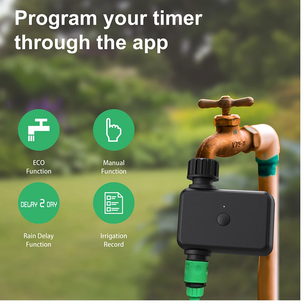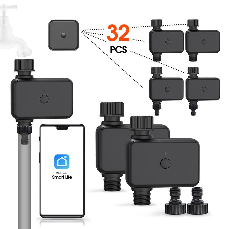 - It is suitable for lawn watering, potted drip irrigation, swimming pool water storage, atomization cooling, temporary watering and other scenarios. WiFi gateway Bluetooth connection, remote voice control switch, support ordinary single timed watering, can also set cycle timed watering plan, manual weather delay, can query the watering record (if the mobile phone is not connected for a long time, the watering record may be lost).
