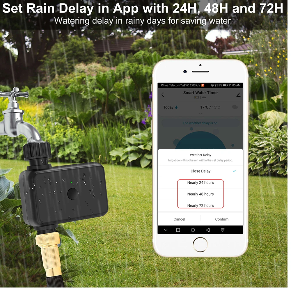 3. According to the local weather, the water valve automatically delays watering (requires a gateway), and the weather delay can also be set manually