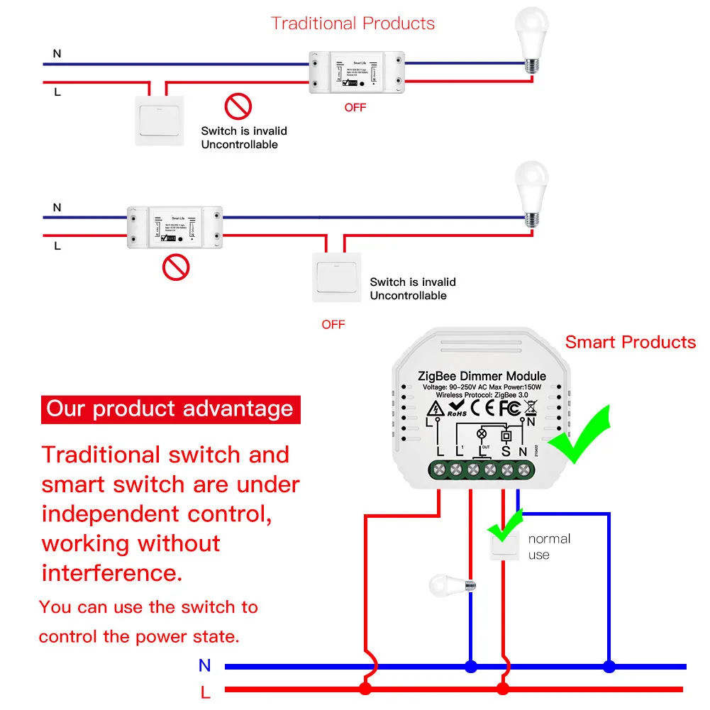 3.1/2 Way Dimmable: Adjust the brightness via Your Voice or Smart Life App freely.It can not only be used as a 1 way circuit switch,but also 2 way supported(two switches control one light).Simply connect it to one of your two traditional switches,then you are able to convert your connected device into a smart one(for 2 way circuit).Allows for hands-free voice and wireless remote control;support Amazon Alexa Google Home voice control and Smart Life and Tuya App control on smart phones with special Tuya ZigBee 3.0 hub required and connected.