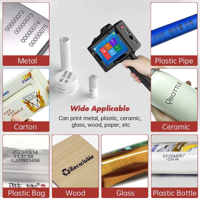 The handheld inkjet marking machine is widely used in most materials, such as wood, various metals, stone, leather, cloth, bamboo, wood, paper, ABS, PVC, epoxy resin, concrete, glass, ceramics, organic materials, polystyrene, plastic, rubber and so on.