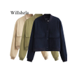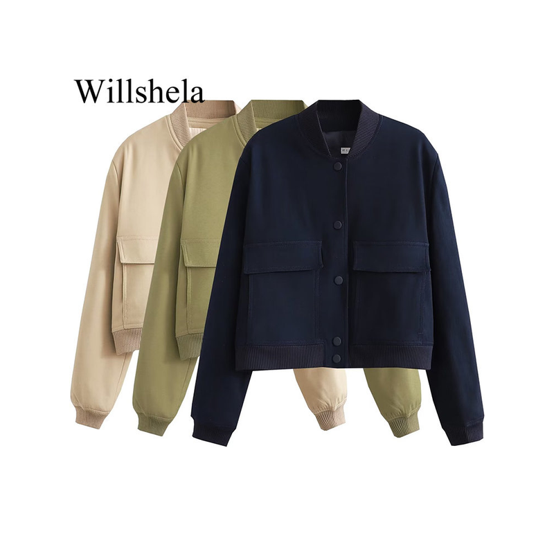 Willshela Women Fashion Solid Bomber Jackets Coat With Pockets V-Neck Single Breasted Long Sleeves Female Chic Lady Outfits