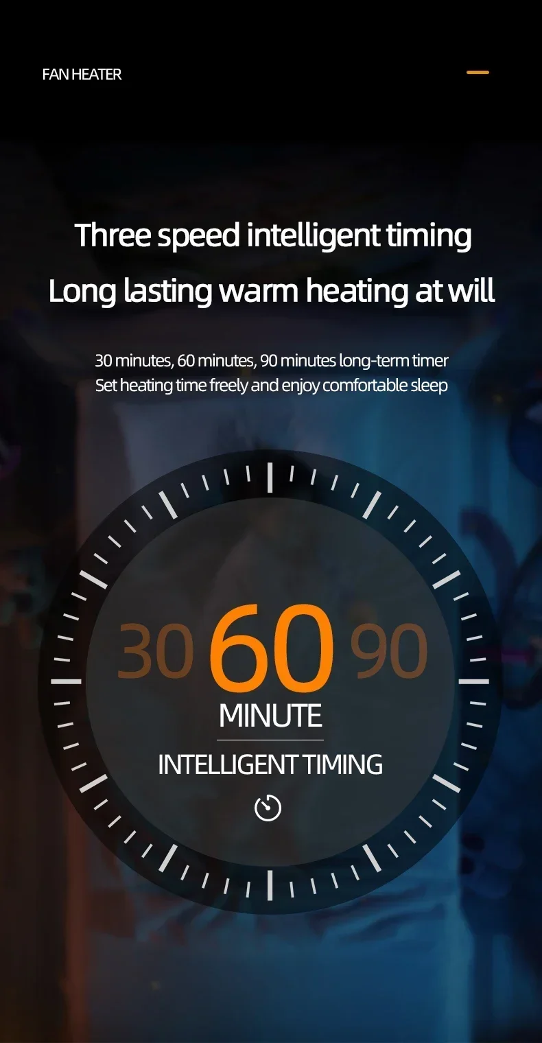 2. This space heater has two temperature options, suitable for warmth and good mood. There are three-speed intelligent timing, 30 minutes, 60 minutes, 90 minutes, as you like, long-lasting warmth. Low noise operation, sleep well every night.