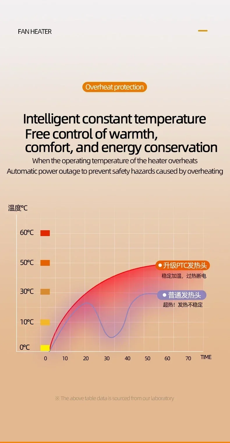 PTC ceramic 1200W fast heating, 3 seconds fast heating. Portable heater, suitable for various scenes.