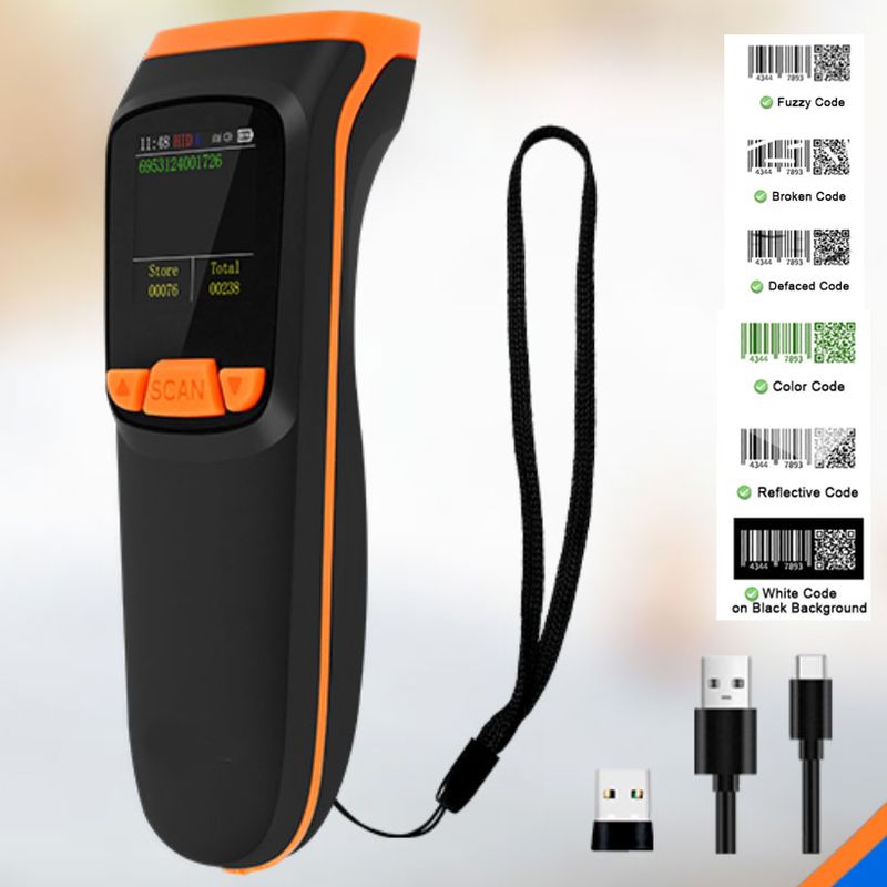 2. This bluetooth barcode scanner comes with large color LCD screen which can display time, battery level, connection mode, barcode data, stored data amount, total scanning amount, etc. Codes data display .