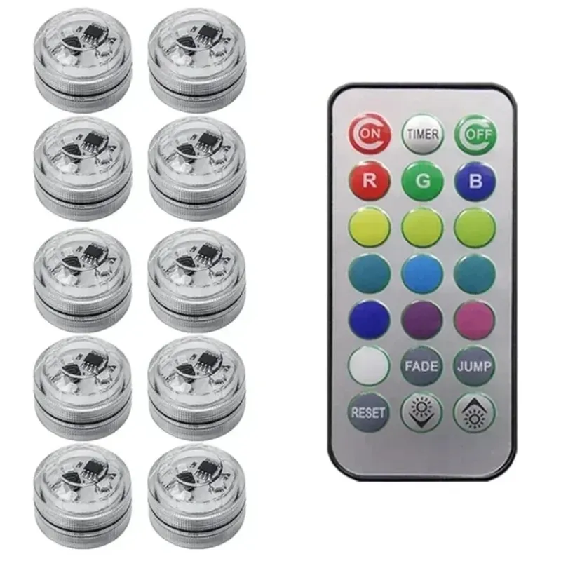 Super bright RGB 3030SMD LED lamp, long life span. The lights case made of high quality PVC, durable and wear-resistant, not easy to be broken. IP67 waterproof design, can use as vase, bowls, aquarium and party decoration light. Comes with remote control, transmit distance up to 10m. Powered by 2 x CR2032 batteries (Included), can work up to 12 hours. After you test these lights, you should take out the battery or put on protective equipment (a small white flakes), otherwise the battery will still slowly consumed.