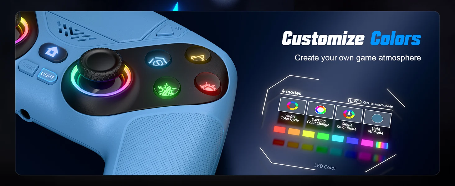This PS5 controller is compatible with both PS5 and Windows PC, featuring easy setup and a built-in Bluetooth 5.3 chip for stable, zero-latency connectivity. It includes customizable RGB lighting with multiple modes. Equipped with high-quality 3D joysticks and buttons for precise control, it also has two customizable back buttons and a Turbo function. The controller boasts a six-axis gyroscope, dual vibration motors, a 1000mAh rechargeable battery, a microphone, speaker, 3.5mm headphone jack, and a touchpad for an immersive gaming experience.