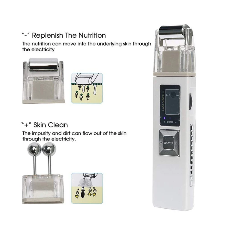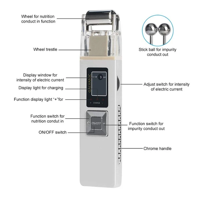 The principle of the Galvanic induction treatment is extremely simple yet effective, the micro electricity emitted by the Galvanic roller will expedite the absorption of nutrition molecules applied to the surface of our skin and accelerate the speed of which they penetrate and combine with our skin cells. Typically, when we apply lotions, only the upper derma of our skinis fed. Any remaining excess will dry up and go to waste. The Galvanic roller will ensure that the nutrition inside the lotion will reach the lower derma of our skin and provide the imperative fruitful source for cell regeneration and growth.