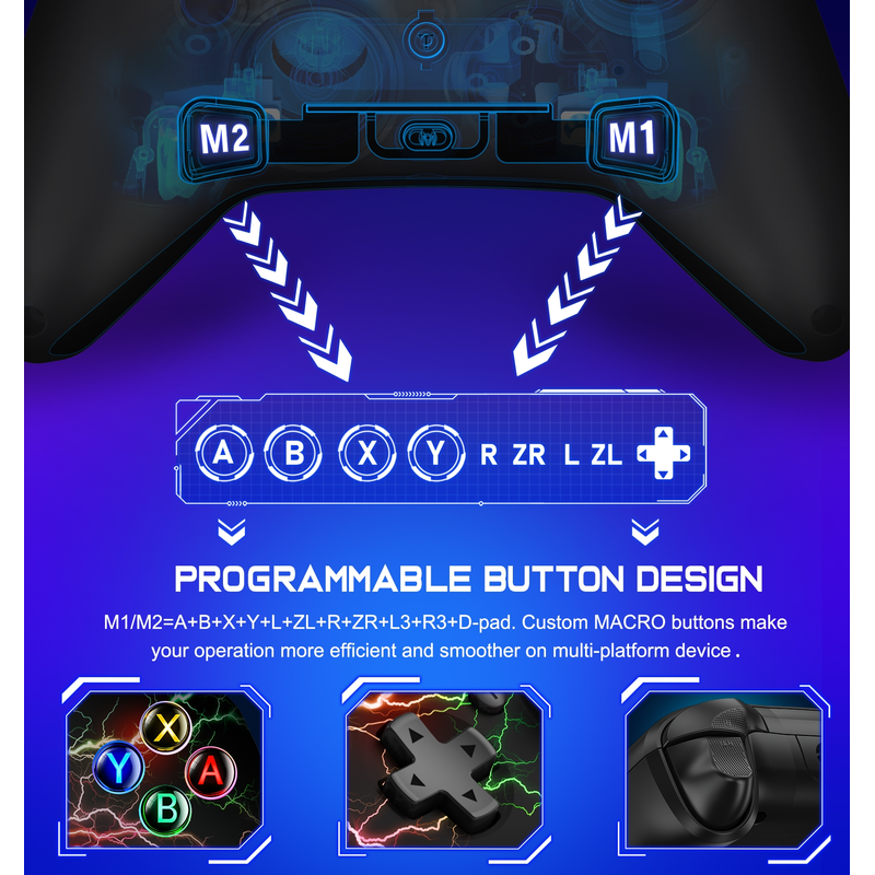This switch pro controller with two rear programming buttons, there are two modes, which are single programming or multi-programming. You can easily assign A/B/X/Y/L/ZL/R/ZR/D-pad button's function to rear button, then you can use pinky to prop up the switch more comfortable and centered.Switch controller with the programmable buttons helping to minimize button abuse and stick clicking it can last more than several years with heavy use.