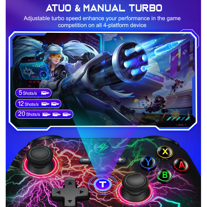 The switch controller has two turbo modes, you can set to auto turbo or manual turbo mode. There are 3 adjustable speed to set: 5shots/s, 12 shots/s or 20 shots/s. You also can customize TURBO button, button A/B/X/Y/L/ZL/R/ZR all can be set to TURBO. For Nintendo switch controller’s continuous shooting function make you more enjoyable to play arcade or action games