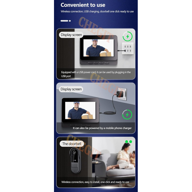 1.About device connection methods: This product cannot be connected to the Internet, cannot install software, and cannot be connected to a mobile phone. When someone rings the doorbell, the display can receive information. ( Important Note )