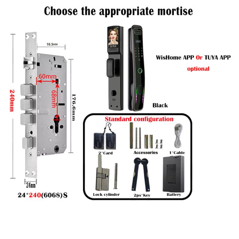 Main features:Face recognition,Remote monitoring,HD screen,Cat's Eys,Security Alert,High capacity battery,Open the handle,Class lock cylinder.