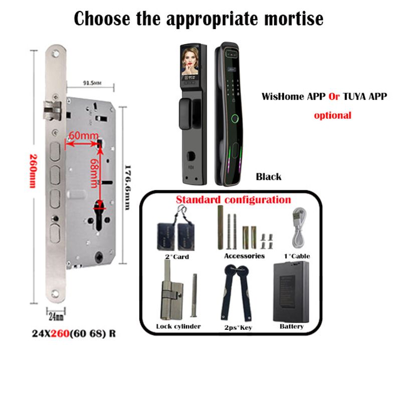 Main features:Face recognition,Remote monitoring,HD screen,Cat's Eys,Security Alert,High capacity battery,Open the handle,Class lock cylinder.
