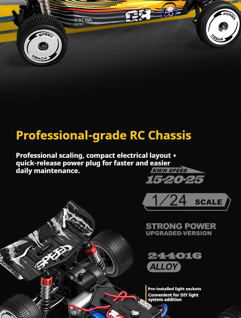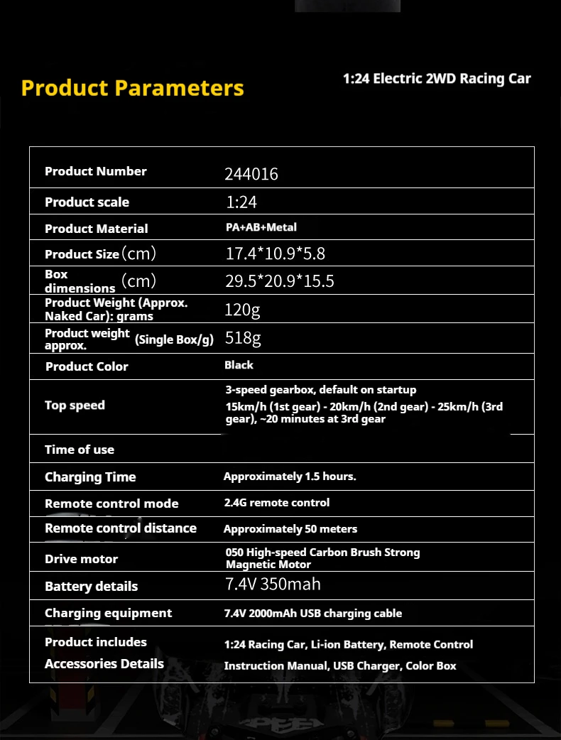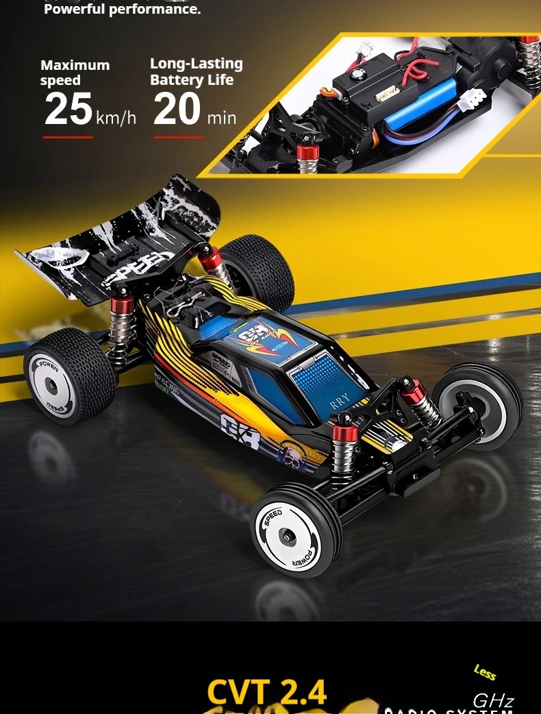 Equipped with 2.4GHz proportional remote control system with proportional throttle/steering and 3-speed adjustable transmission.